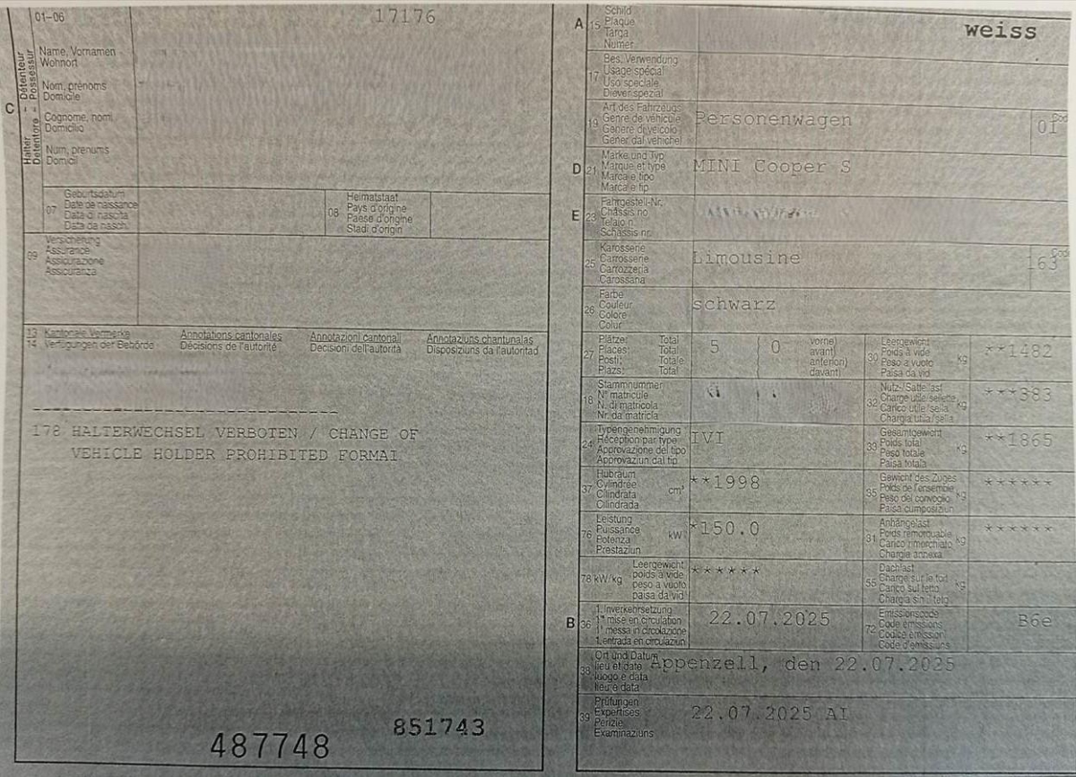 Antiblockiersystem (ABS), Dynamische Stabilitätskontrolle (DSC), Lenkrad: Servolenkung, Lackierung: Uni-Lackierung, Heckscheibenheizung, Aussenspiegel rechts und links beheizbar und elektrisch verstellbar, Licht: Nebelschlussleuchte, Scheibenwaschdüsen beheizt, Regensensor für Scheibenwischer vorne, Zentralverriegelung mit Fernbedienung, Airbag: Airbag Fahrer und Beifahrer, Pollenfilter (Staubfilter), Airbag: Seitenairbag für Fahrer und Beifahrer, Gurtkontrolle, 3-Punkt-Sicherheitsgurte auf allen Plätzen, Elektronische Parkbremse, Auto Start-/ Stop-Anlage, Crash-Sensor, Assist: Geschwindigkeitsregelung mit Bremsfunktion, Räder: Abschliessbare Radschrauben, Reifenreparatur-Set, Media: DAB+ (Digital Audio Broadcasting), Media: ConnectedDrive Services, Fensterheber elektrisch Komfortöffnen und -schliessen aller Fahrzeugfenster über Funkfernbedienung, Airbag: Kopfairbag vorne und hinten, Licht: LED Scheinwerfer - Bi-LED-Licht für Abblend- und Fernlicht-Funktion, inkl. LED-Heckleuchten., Klima: 2-Zonen-Klimaautomatik, Einstiegsleisten - mit modellspezifischem Schriftzug in Metalloptik., Garantie: 3 Jahre oder 100 000km Gewährleistung (Es gilt das zuerst erreichte), TeleService, Intelligenter Notruf, Gesetzlicher Notruf, Räder: Reifendruck-Kontrollanzeige, Getriebe: Sequentielles 7-Gang-Getriebe mit Automatikfunktion, Warndreieck - inklusive Erste-Hilfe-Set., Assist: Driving Assistant - Radarbasiertes Fahrerassistenzsystem bestehend aus: Spurwechselwarnung, Querverkehrswarnung hinten mit Bremseingriff, Safe Exit, Prävention Heckkollision, Airbag: Airbag Beifahrer deaktivierbar, Polster: Textil Double Cloth, Innenraumbeleuchtung - Innen-Leselicht Touch Bedienung und Auflicht vorne und hinten - Ambiente Beleuchtung - Ambiente Fussraumleuchte - Gepäckraumleuchte -LED-Make-Up-Leuchte vorn links und rechts; Sonnenblende - weiss -Ausstiegsleuchte vorne - weiss, Media: Personal eSIM, Assist: Parking Assistant Kamera- und ultraschallbasiertes Assistenzsystem bestehend aus: - Parkassistent -Rückfahrassistent - Active Park Distance Control - PDC (ultraschallbasiertes Fahrerassistenzsystem) - Einparkhilfe Seite - Parken-Anfahrüberwachung -Anhängerassistent - Rückfahrkamera mit Panoramaansicht hinten, Media: MINI Interaction Unit - rundes Zentralinstrument - Fläche 440 cm² - OLED Technologie -MINI Spezifische Nutzeroberfläche, Sitze: Kindersitzbefestigung i-Size für Beifahrer, Assist: Aufmerksamkeitsassistent, Sitze: Rücksitzbank mit 60/40 Teilung, Steckdose - 1 x 12 V (Mittelkonsole vorne) - 2 x USB-C-Anschlüsse (Mittelkonsole vorne), Fahrwerk: Serienfahrwerk, Ablagemöglichkeiten - Getränkehalter (Mittelkonsole vorne/ Zwei Cupholdereinsätze und Einlegematte) - Türtasche (vorne und hinten) -Handschuhkasten, Aktiver Fussgängerschutz