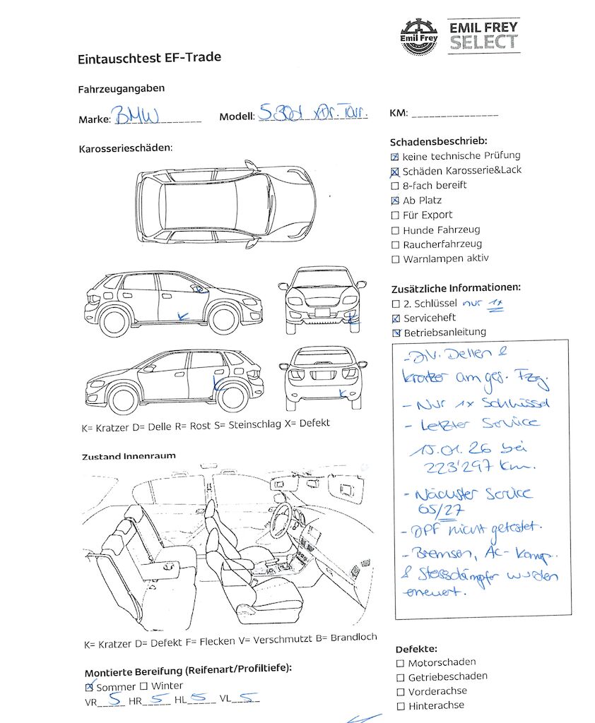 Keine Gewähr auf die Angaben der Sonder- und Serienausstattung / keine mechanische Prüfung. Fahrzeug wurde unzerlegt expertisiert / keine Haftung für allfällige, nach Demontage bekanntwerdenden Mängel. Fahrzeugbereifung und Ausstattung gemäss Fotos / Fahrzeugkauf auf eigenes Risiko ab Platz ohne Nachwährschaft.- Div. Dellen und Kratzer am ges. Fahrzeug.- Nur 1x Schlüssel- Letzter Service 01.26 bei 223'297- Bremsen, AC-Kompressor und Stossdämpfer neu!