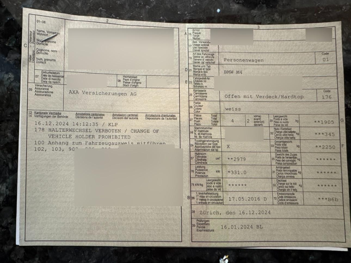 Heckscheibenheizung, Assist: Dynamische Traktionskontrolle (DTC), Nichtraucherausführung, Make up-Spiegel rechts, Lenkrad: Lenkrad längs- und höhenverstellbar, Pollenfilter (Staubfilter), Wärmeschutzverglasung, Kopfstützen hinten, Make up-Spiegel links, Einstiegsschienen vorne, Scheibenwischer vorne mit Regensensor und automatischem Einschalten der Abblendlichter, Auspuffanlage mit 2 Endrohren (links und rechts), 5 Lautsprecher, Zusätzliche 12V Steckdosen, Rücksitzlehne geteilt abklappbar, Kreuzstützen für Vordersitze verstellbar, Innen- und Aussenspiegel automatisch abblendend, Befestigungsösen im Laderaum, Instrumentenkombination mit erweiterten Umfängen, Armauflage vorne, verschiebbar, Elektrische Lenkung (EPS), Gangempfehlung, Scheibenwischer vorne mit Intervall, Servotronic, ISOFIX Kindersitzvorrichtung, Bordcomputer, Dekor: Interieurleisten in Blue Shadow, Intelligenter Notruf, Blinker in Aussenspiegel, Start-/Stop-Knopf, Radio BMW Professional, Airbag: Airbag Beifahrer deaktivierbar, Head-Up Display, Vordersitze elektrisch verstellbar, mit Memoryfunktion, Verbandskasten, M Leichtmetallfelgen im V-Speichen- Design 513 M, 18J, Aussenspiegel in Wagenfarbe, Überrollschutzsystem, Assist: Tempomat mit Bremsfunktion, M Drive, Katalysator geregelt, DAB+ (Digital Audio Broadcasting), Xenon-Lichtanlage, TeleService, Lackierung: Uni-Lackierung, Nebelscheinwerfer, Scheinwerfer-Waschanlage, Lenkrad: Multifunktionslenkrad, Sitze: Sportsitze vorne, Hardtop, Lehnenbreitenverstellung inkl. Lordosen- stütze, Stossstangen, Aussenspiegel und Türgriff in Wagenfarbe, Frontscheibe mit Color-Band, Seitenaufprall-Schutzsystem, Wegfahrsperre elektronisch, Sequentielles 7-Gang-Getriebe mit Automatikfunktion, Airbag: Airbag Fahrer und Beifahrer, 2-Zonen-Klimaautomatik, Aussenspiegel rechts und links beheizbar und elektrisch verstellbar, Dynamische Stabilitätskontrolle (DSC), Bremsassistent (BAS), Aux-In Anschluss, Auto Start-/Stop-Anlage, Dynamische Bremsleuchten, Park Distance Control vorne und hinten, Drittes Bremslicht, Lichtpaket, BMW Individual Dachhimmel Anthrazit, Leder-Ausstattung Merino, erweitert, Bremsenergie-Rückgewinnung, Aussentemperaturanzeige, Antiblockiersystem (ABS), Kopfstützen vorne höhenverstellbar, Assist: Crash-Sensor, Ablagen in den Türen, Akzentleisten schwarz hochglänzend, Exterieurumfänge in Aluminium satiniert, Vordersitze heizbar, Zentralverriegelung mit Fernbedienung, Soft Close Automatik für Heckklappe, Auspuffblende, verchromt, M-Lederlenkrad, Räder: Reifendruck-Kontrollanzeige, Veloursfussmatten vorne und hinten, Abschliessbare Radschrauben, Airbag: Seitenairbag für Fahrer und Beifahrer, Elektrische Fensterheber vorne