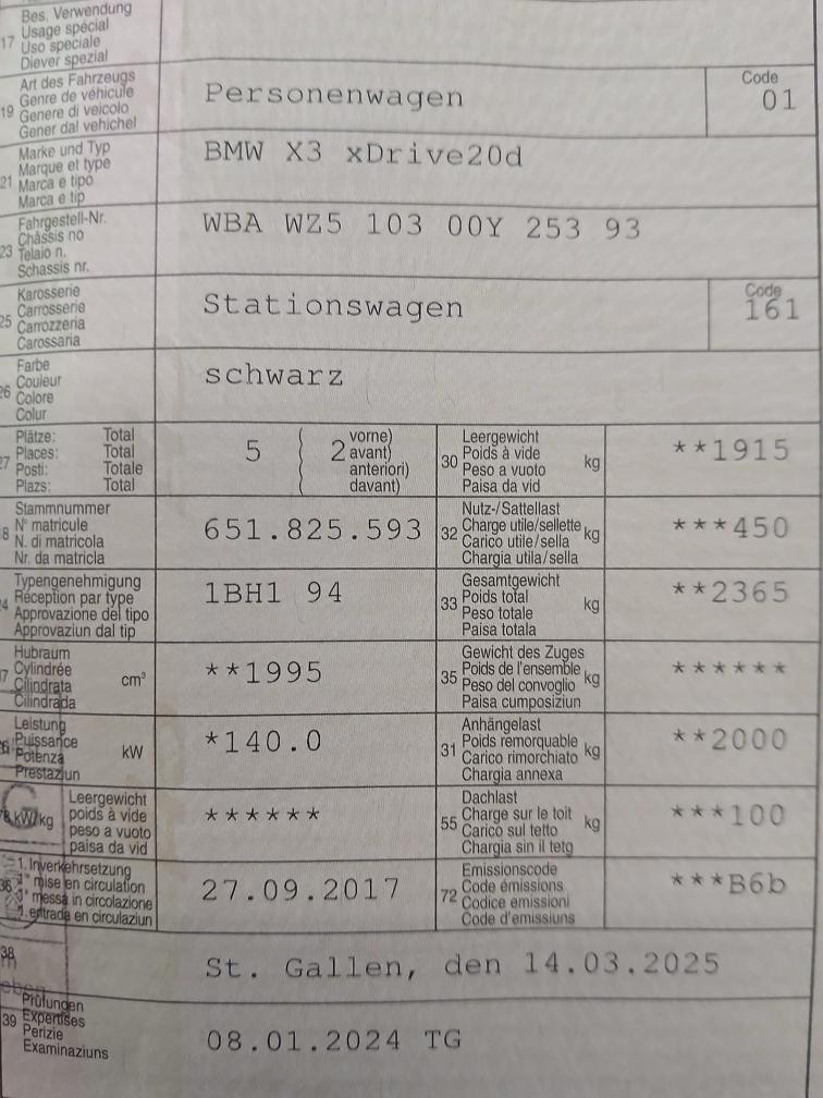 Gepflegter BMW X3. Technisch nicht geprüft. Fahrzeug läuft einwandfrei ohne Mängel. Warnlampen leuchten keine. Service ist fällig. 8-Fach Bereift. Profil ist bei Sommer und Winter sicher noch für 1 Saison Fahrbar. 2 Schlüssel vorhanden. Dieselfilter erfolgreich getestet. Ist innen und aussen in einem guten Zustand. Leichte Gebrauchsspuren. Fahrzeug MUSS innert 7 Tage abgeholt werden. Banküberweisung.