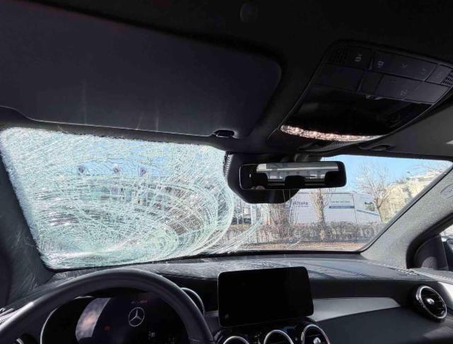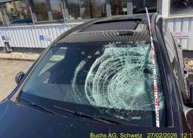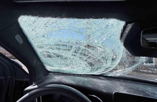 Windschutzscheibe ist gerissen. Glasdach beschädigt.