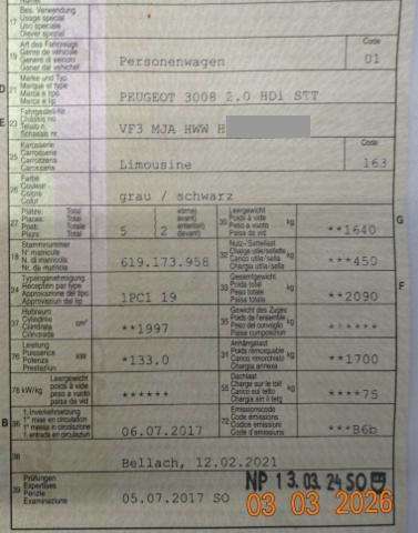 Airbag Fahrer und Beifahrerseite Sitzheizung vorne Elektrische Fensterheber vorne + hinten Aussenspiegel elektrisch verstellbar und heizbar Seitenairbag Fahrer und Beifahrerseite Zentralverriegelung mit Fernbedienung Höhenverstellbarer Beifahrersitz Mittelarmlehne vorne ABS und EBV Elektr. Bremskraftverteilung Dachreling Alu Deaktivierung Beifahrerairbag ESP/ ASR Vorhangairbags vorne + hinten DSC Dynamische Stabilitäts-Control Zwei Zonen-Klimaautomatik Leichtmetallfelgen 19" Rückfahrkamera 12 V Steckdose 3x Elektronische Servolenkung Pack Visibilité Dieselpartikelfilter Isofix-Kindersitzbefestigung hinten Spurassistent Keyless Schliess- und Startsystem Höhenverstellbarer Fahrersitz Reifendruck-Sensoren RDS Seitenscheiben im Fond und Heckscheibe abgedunkelt Heckklappe elektrisch Elektrische Parkbremse Einparkhilfe hinten Schwarzes Dach Pedalerie in Aluminium Reifenreparatur-Kit Stop + Start System Einparkhilfe vorne LED Tagfahrlicht Aussenspiegel elektrisch einklappbar Sitzbank hinten 1/3 - 2/3 umklappbar Totwinkel-Assistent Keine Gewähr auf die Angaben der Serienausstattungen Lederlenkrad perforiert Radio/ MP3/ USB/ Bluetooth/ Fernbed. am Lenkrad DAB+ Digital Audio Broadcast LED-Nebelscheinwerfer Sitzbezüge in Alcantara/ Kunstleder Verkehrsschild-Erkennungssystem Mirror Link Navigationssystem/ Peugeot Connect I-Cockpit Amplify Garantie 3 Jahre/ 80'000 km Full LED Technology