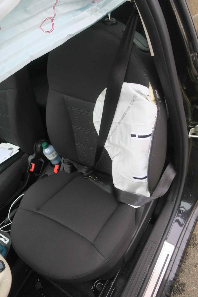 Ganze Seite links, Kopf, Seitenairbag links inkl. Gurtstraffer links sind ausgelöst. Motor Getriebe Vorderachse Hinterachse Airbags ausgelöst: 2 unbekannt ( Abfallcode 16.01.04ak )