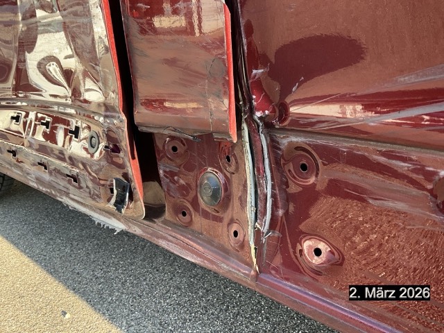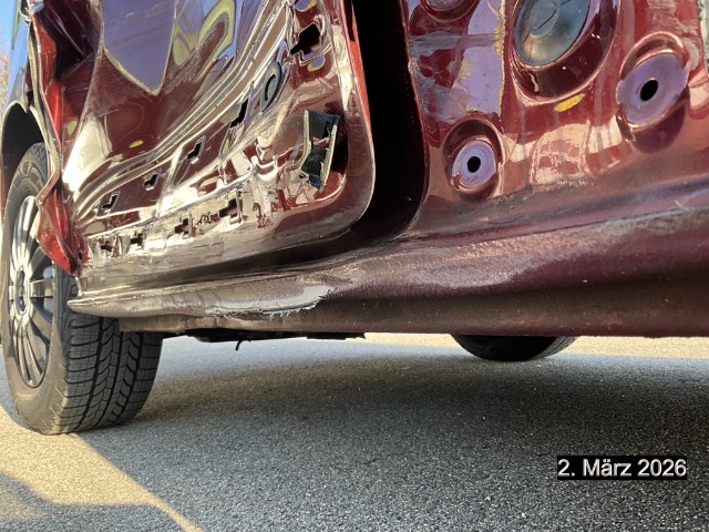Beschreibung der Schäden: Seite links: Kotflügel, Türe, B-Säule, Schwelle, Seitenwand vorne eingedrückt und zerkratzt