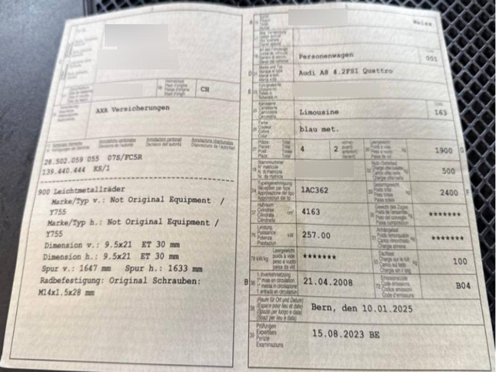 MMI high, Wartungsintervall-Anzeige, Teppichfussmatten vorne und hinten, Beide Make up-Spiegel beleuchtet, Fussraumbeleuchtung vorne und hinten, Allradantrieb permanent, Klima: Pollenfilter (Staubfilter), Geruchssensor, Drehzahlmesser, 3-Punkt-Sicherheitsgurte auf allen Plätzen, Leseleuchten hinten, Zierleisten an Dachrahmen und Fensterschacht grau eloxiert, Licht: Nebelschlussleuchte, Tire Fit (Reifendichtmittel) anstelle Faltrad, Regensensor für Scheibenwischer vorne, Höhenverstellbare Gurten vorne, MMI - Multi Media Interface, Katalysator geregelt, Beleuchtetes und abschliessbares Handschuhfach, Durchladesystem inkl.Skisack, Wegfahrsperre elektronisch, Cupholder vorne und hinten, Bi-Xenon-Scheinwerfer inkl. Reinigungsanlage, Diebstahlwarnanlage mit Innenraum- überwachung, 6-Stufen-Automat Tiptronic, Bordcomputer, Scheibenwaschdüsen beheizt, CD-Laufwerk, Nebelscheinwerfer, Airbag: Airbag Fahrer und Beifahrer, Sitze: Vordersitze heizbar, Fahrer-Informationssystem, Airbag: Seitenairbags vorne und hinten, Assist: Bremsassistent (BAS), Heckscheibenheizung, Bremsbelag-Verschleissanzeige, Reserverad, Radio-High, Nichtraucherausführung, Elektrisch verstellbares Lenkrad, Abblendlichtausschaltverzögerung 'Follow me home', Tiptronic-Multifunktionslenkrad, Scheibenwischer vorne mit Intervall, Wassertemperaturanzeige, Elektronische Parkbremse, Innenlicht-Abschaltverzögerung, Servolenkung geschwindigkeitsabhängig, Elektrische Fensterheber vorne + hinten, Tageskilometerzähler, 3 Kopfstützen hinten, Aussentemperaturanzeige, Stossstangen und Aussenspiegel in Wagenfarbe, Mittelarmlehne hinten, Valcona Leder-Ausstattung, Aktive Kopfstützen, Ausstiegsleuchten in den Türen, Holzapplikationen Nussbaum, Tempomat, Vordersitze elektrisch verstellbar, Leuchtweitenregulierung automatisch, Elektronische Differentialsperre (EDS), Klima: Klimatisierungsautomatik, Mittelarmlehne vorn in Kunstleder schwarz mit Kontrastnaht in Rot, Digital Uhr, Getönte Scheiben, Aluminiumräder im 10-Loch-Design 8Jx17, Aussenspiegel rechts und links beheizt, elektrisch verstell- / und einklappbar, Zentralverriegelung mit Fernbedienung, Tankdeckel-Entriegelung von innen, Elektronisches Stabilitäts-Programm (ESP), Licht: Tagfahrlicht, Gurtstraffer vorne und hinten, Türgriffe aussen in Wagenfarbe, Leseleuchten vorne, Lichtwarnsummer, Licht: Drittes Bremslicht, Airbag: Window-Kopfairbags, Antriebsschlupfregelung (ASR), Innen- und Aussenspiegel automatisch abblendend, Audi Bluetooth Autotelefon, inklusive Hörer in Mittelarmlehne, Untere Decoreinlagen Aluminium gebürstet titaniumgrau, Schutzleisten in Wagenfarbe, Antiblockiersystem (ABS), Radiovorbereitung, Scheibenantenne, Ent- störung und 8 LS, Adaptive air suspension: elektronisch geregelte Luftfederung