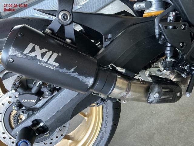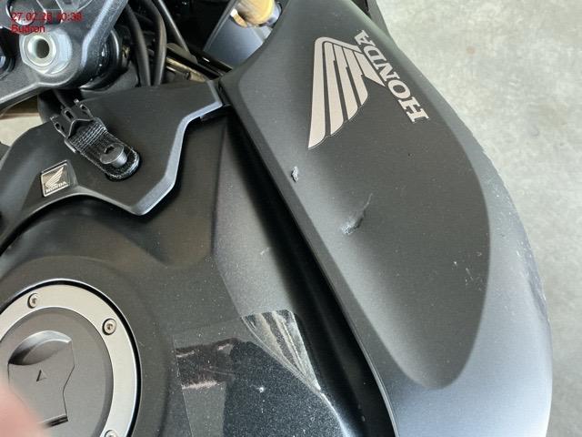 Beschreibung der Schäden: Guidon, levier de frein droite, cache latéraux avant, réservoir de frein avant, rétroviseur, radiateur, échappement, cache protection disque avant, carter moteur droit, repose pied droite, fourche avant, réservoir, liste non-exhaustive