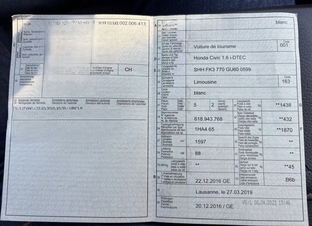 Avant droit du véhicule entièrement endommagé. Véhicule livré avec des roues d'été. Documents du véhicule disponibles. Le véhicule ne peut pas rouler. Le moteur démarre et fonctionne normalement. Côté droit, partie avant droite, demi essieu avant droit, direction endommagés. Choc sur le montant "A". Passage de roue avant droite enfoncé et refoulé. Risques sur le différentiel, tous les radiateurs. le berceau moteur, les phares. Divers éléments de carrosserie sont légèrement endommagés. ATTENTION, Le siège arrière droit sera remis en place (déposé dans le véhicule). Il est endommagé (dommage environ CHF 300.-) sur la partie arrière (coffre) par un animal, chien. Motor Getriebe Vorderachse Hinterachse Airbags ausgelöst: 0 unbekannt ( Abfallcode 16.01.04ak )