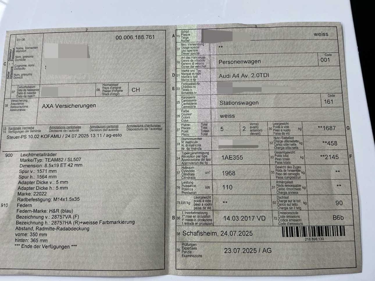 Bordcomputer, Sitze: Vordersitze manuell verstellbar, Elektrische Fensterheber vorne + hinten, Audi pre sense city, Zentralverriegelung mit Fernbedienung, Media: MMI Radio plus, Geschwindigkeitsbegrenzer, Kofferraumfernentriegelung, Elektronische Differentialsperre (EDS), Höhenverstellbare Gurten vorne, Antriebsschlupfregelung (ASR), Radwechselwerkzeug, Polster: Stoff-Ausstattung, Radiovorbereitung, Scheibenantenne, Ent- störung und 8 LS, Nebelscheinwerfer, Sequentielles 7-Gang-Getriebe mit Automatikfunktion, Bremsenergie-Rückgewinnung, Ablagen in den Türen, Assist: Bremsassistent (BAS), Klima: Pollenfilter (Staubfilter), Airbag: Airbag Fahrer und Beifahrer, Sicherheitslenksäule, Rücksitzlehne geteilt abklappbar, Schlüsselloser Motorstart, Media: Bluetooth-Schnittstelle, Wartungsintervall-Anzeige, Getönte Scheiben, Media: Digitaler Radioempfang (DAB), Seitenaufprall-Schutzsystem, Lenkrad: Lenkrad längs- und höhenverstellbar, Scheibenwischer vorne mit Intervall, Lichtwarnsummer, Innenlicht-Abschaltverzögerung, Bremsbelag-Verschleissanzeige, Audi drive select, Heckscheibenheizung, Cupholder vorne, Gurtstraffer vorne, MMI basic, Kindersitzvorrichtung ISOFIX mit Deaktivierungsschalter für Beifahrer- Airbag, Elektronische Parkbremse, Antiblockiersystem (ABS), Befestigungsösen im Laderaum, Wassertemperaturanzeige, Fahrer-Informationssystem, Xenon Plus-Scheinwerfer, Dachreling eloxiert, Autobahnblinkfunktion, 3 Kopfstützen hinten, Servolenkung geschwindigkeitsabhängig, Aussentemperaturanzeige, Stossstangen und Aussenspiegel in Wagenfarbe, Klima: Klimatisierungsautomatik, Garantie: 2 Jahre ohne Kilometerbegrenzung (ab 1. Inv.), Gepäckraumklappe automatisch öffnend und schliessend, Digital Uhr, Servotronic, Brillenablage, Wärmeschutzverglasung, Sitze: Vordersitze höhenverstellbar, Leichtmetallräder im 10-Speichen-Kristal Design 7,5x17J, Seitenairbag für Fahrer und Beifahrer, Elektronisches Stabilitäts-Programm (ESP), Leuchtweitenregulierung elektrisch, Teppichfussmatten vorne und hinten, Radschrauben mit Diebstahlsicherung, Aussenspiegel rechts und links beheizbar und elektrisch verstellbar, Räder: Reifendruck-Kontrollanzeige, Warndreieck, Fahrwerk: Dynamisches Fahrwerk, 3-Punkt-Sicherheitsgurte auf allen Plätzen, Airbag: Window-Kopfairbags, Tageskilometerzähler, Licht: Tagfahrlicht, Dekorelemente Aluminium Ellipse, Aschenbecher und Zigarettenanzünder, Wagenheber, Paket: Glanzpaket, Aktive Kopfstützen, Mittelarmlehne vorn in Kunstleder schwarz mit Kontrastnaht in Rot, Licht: Nebelschlussleuchte, Lenkrad: Leder-Multifunktionslenkrad im 3-Speichen-Design, Lackierung: Uni-Lackierung, Türgriffe aussen in Wagenfarbe, Gepäcktrennnetz, Stop/Start-Technologie, Partikelfilter und Oxydationskatalysator, Räder: Reifenreparatur-Set (Tire Fit), Drehzahlmesser, Licht: Drittes Bremslicht, Kindersicherung an den hinteren Türen, Wegfahrsperre elektronisch, Leseleuchten vorne, Sonnenblende zweifach