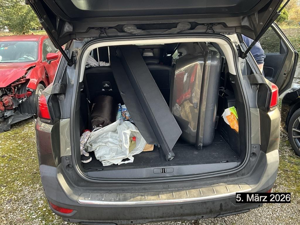 Drehzahlmesser, Gurtkontrolle, Bremsassistent (BAS), Digital Uhr, Bordcomputer, Licht: LED-Tagfahrlicht, Höhenverstellbare Gurten vorne, Park Distance Control vorne und hinten, Automatisches Einschalten der Abblendlichter, Airbag: Fahrer und Beifahrer, Gangempfehlung, Regensensor für Scheibenwischer vorne, Head-Up Display, Assist: Verkehrsschild-Erkennungssystem, Media: USB-Anschluss, Navigationssystem mit Sprachsteuerung Peugeot Connect SOS und Assistance, Aussenspiegel rechts und links beheizbar und elektrisch verstellbar, Elektronische Parkbremse, Airbag: Window-Kopfairbags, Dynamische Traktionskontrolle (DTC), Audio MP3-Player, Assist: Spurhalteassistent Lane Assist, Wassertemperaturanzeige, Elektronisches Stabilitäts-Programm (ESP), Kopfstützen vorne höhenverstellbar, Assist: Active Safety Brake, Getriebe: 6-Gang-Getriebe, Radiovorbereitung, Antenne, Entstörung und 6 LS, Zierleisten aussen in Chrom, Katalysator geregelt, Kühlergrill verchromt, Wartungsintervall-Anzeige, 3-Punkt-Sicherheitsgurte auf allen Plätzen, Gurtstraffer vorne, Stopp-/Start-System, Zentralverriegelung mit Fernbedienung, Media: Touchscreen, Assist: Spurhalteassistent,Fernlichtassistent,Verkehrsschilderkennung und Geschwindigkeitsempfehlung, Assist: ABS, EBD, elektronische Bremskraftverteilung, Steckdose 12V, 3x, Klima: 2-Zonen-Klimaautomatik, Sitze: Beifahrersitz höhenverstellbar, Toter-Winkel-Warnsystem, Bluetooth Freisprecheinrichtung, Servolenkung geschwindigkeitsabhängig, Beide Make up-Spiegel beleuchtet, Kindersicherung an den hinteren Türen, Mirror Screen, Aussenspiegel elektrisch anklappbar, ISOFIX Kindersitzvorrichtung, Elektrische Fensterheber vorne + hinten, Licht: Drittes Bremslicht, Ambientebeleuchtung, Tempomat mit Geschwindigkeitsbegrenzer, Fahrersitz mit Lordosenstütze, Berganfahrhilfe, Sitze: Fahrersitz höhenverstellbar, LED Innenlichtpaket, Antennen-Diversity, Handschuhfach, Pollenfilter (Staubfilter), Heckscheibenheizung, Räder: Reifendruck-Kontrollanzeige, Licht: Nebelscheinwerfer, Umfeldbeobachtung Front-Assist, Coming-home-Funktion, Aussenspiegel in Wagenfarbe, Beifahrersitz mit Klapptisch, Aussentemperaturanzeige, Radio, Naturlederlenkrad, Wegfahrsperre elektronisch, Airbag: Seitenairbag für Fahrer und Beifahrer, Abgedunkelte Seiten- und Heckscheibe, Seitenschwellerschutz, Türgriffe aussen in Wagenfarbe, Antriebsschlupfregelung (ASR), Ladeboden variabel, Räder: Leichtmetallfelgen Detroit 18J, Polster: Stoff-/Kunstleder-Ausstattung, Dachreling in Aluminium, Innenspiegel abblendbar