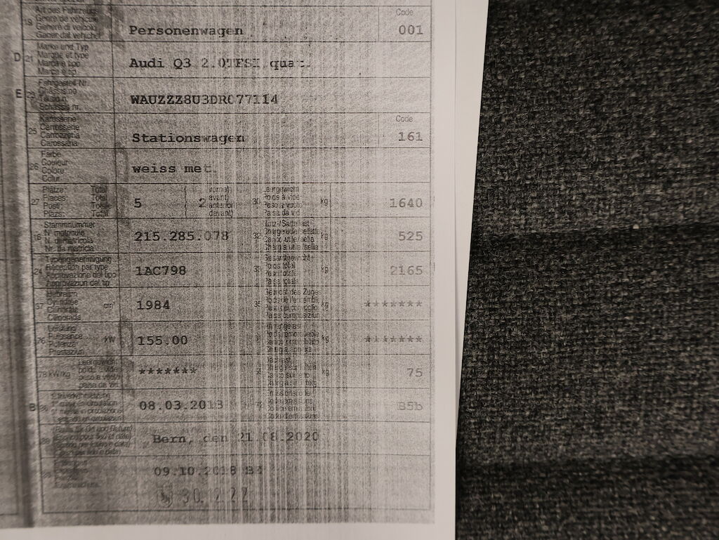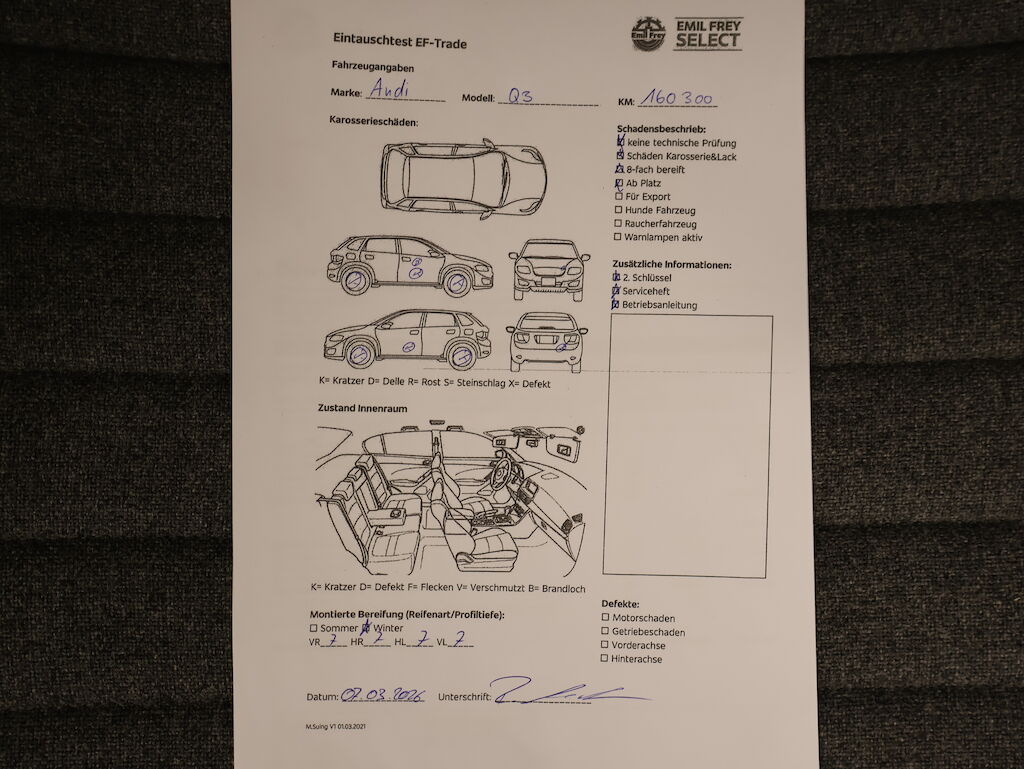Keine technische Prüfung (Werkstatttest) vorgenommen Leichtes Knarckgeräusch beim lenkden ev. Domlager oder Federn? Diverse Schäden an Karosserie/Lack. 8-fach bereift. Zustand Sommerräder ? Fahrzeug ab Platz, ohne Garantie und Aufbereitung. Motor Getriebe Vorderachse Hinterachse Airbags ausgelöst: 0 unbekannt ( Abfallcode 16.01.04ak )