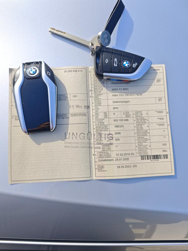 Top gepflegter BMW X3 M40i ohne OPF mit super Ausstattung - 100200km - JG 2018 - Glaciersilber metallic - 8-fach bereift 19 Zoll Winterräder 21 Zoll Sommerräder ca. 3.5mm, Flanke abgegahren - Schweizer Fahrzeug - Immer bei Bmw im Service - Bremsen Ersetzt - Service gemacht Ausstattung: • Panorama-Glasdach • Head-Up Display • 360° Surround View Kamera • Harman Kardon Soundsystem • Beheizbares Sportlenkrad • M Sportpaket • LED-Scheinwerfer • Elektrische Sitze mit Memory Funktion • Navigationssystem Professional • Parkassistent • Komfortzugang • Elkr. Heckklappe