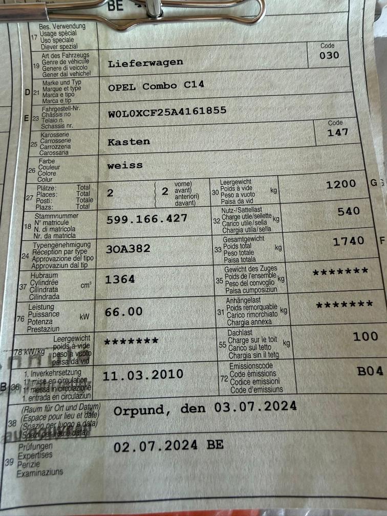 Zu verkaufen: Opel Combo mit wenigen Kilometern Zu verkaufen steht ein Opel Combo mit wenigen Kilometern. Bekannte Mängel: • Geräusche vorne vom Radlager (Radlager vorne vermutlich defekt) • Knacken beim Lenken Es wurde kein Werkstatttest durchgeführt. Das Fahrzeug wird ab Platz / ab Platte verkauft, ohne Garantie oder Gewährleistung. Das Fahrzeug muss innerhalb von fünf Arbeitstagen abgeholt werden, ansonsten entstehen Standgebühren von CHF 20.– pro Tag.