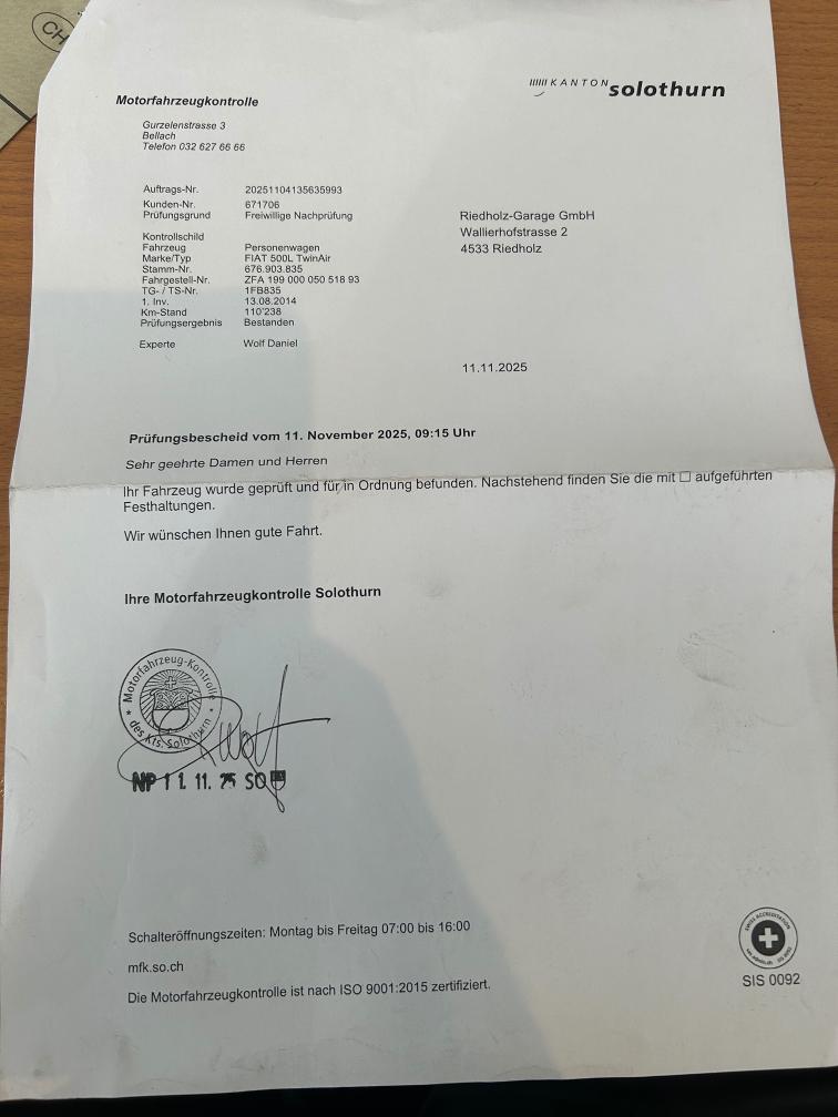 Fiat 500L – frisch ab MFK Zu verkaufen: ein gepflegter Fiat 500L, frisch geprüft ab MFK. Das Fahrzeug fährt und schaltet einwandfrei – keine ungewöhnlichen Geräusche oder Fehlermeldungen. Bitte beachten Sie: Es handelt sich um ein Occasionsfahrzeug, kleine Beulen oder Kratzer können vorhanden sein. Ausstattung: Motor 0.9 / 105 PS Benzin 6-Gang-Schaltgetriebe Regen- und Lichtsensor Parkhilfe hinten Tempomat & Limiter Radio/CD, Telefon, AUX, Bluetooth Klimaanlage Schiebe- bzw. Glasdach Isofix Elektrische Fensterheber 4-fach bereift Multifunktionslenkrad 2 Schlüssel Frisch ab MFK Für Fragen oder eine Besichtigung rufen Sie uns gerne an: 032 517 90 90 Freundliche Grüsse Riedholz Garage GmbH
