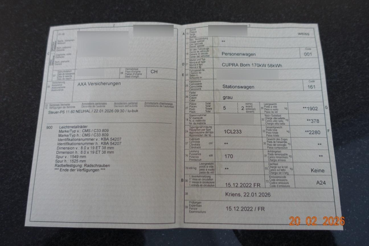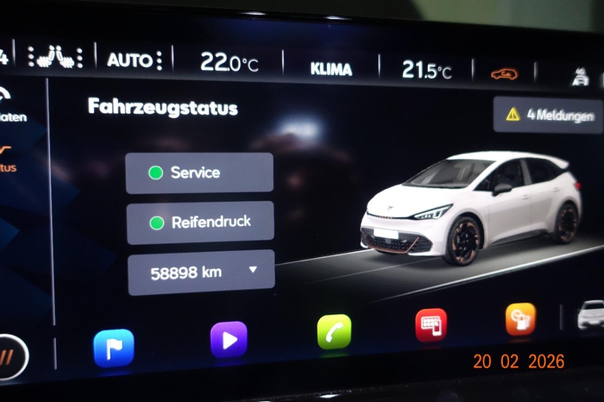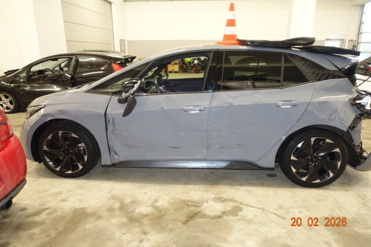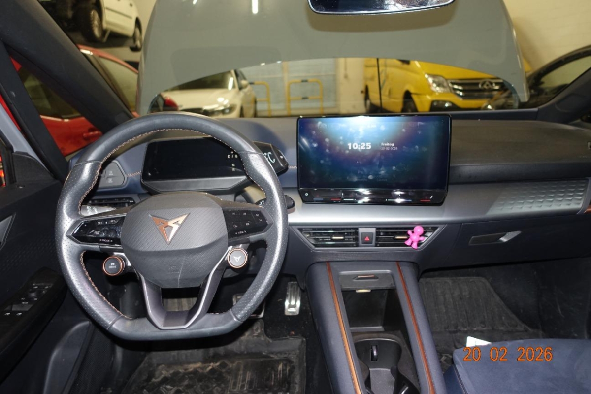 Licht: Durchgehende Full LED-Heckleuchten, Media: Mobiltelefon Freisprechanlage Bluetooth, Zentralverriegelung "Keyless-Go", Klima: 2-Zonen Climatronic, Heckscheiben-Wisch-/Waschanlage mit Intervall, Aussenspiegel elektrisch einstell-, beheiz- und einklappbar mit Beifahrerabsenkfunktion, 5.3" Full Digital Cockpit, Lenkrad: Supersportlenkrad mit Start-/ Drive Profile-Knopfsystem,beheizbar, Lenkrad: Beheizbares Ledermultifunktionslenkrad, Garantie: Cupra 12 Jahre Gewährleistung gegen Karosserie-Durchrostung (ab 1. Inv.), Garantie: Cupra 3 Jahre Lack-Gewährleistung (ab 1. Inv.), Licht: Drittes Bremslicht, Garantie: Cupra Garantie Batterie- Gewährleistung 8 Jahre oder 160’000 KM auf 70% Batterieleistung. (ab 1. Inv.), Airbag: Kopfairbags vorne und hinten, Assist: Tiredness detection (Müdigkeitserkennung), Ladekabel (Mode 3), Gurtkontrolle, ABS, EBV elektronische Bremskraft-verteilung, Assist: Einparkhilfe vorne und hinten mit optischer Anzeige, Sitze: Mittelarmlehne vorne, Sitze: Fahrersitz höhenverstellbar, Sitze: Kindersitzverankerung ISOFIX hinten, Aussenspiegel in Cosmo Grey, Türgriffe in Wagenfarbe, Sonnenblende Fahrer und Beifahrerseite mit beleuchtetem Spiegel, Seitenschweller, Getriebe: 1-Gang Automatik, Lackierung: Uni-Lackierung, Räder: Tool Kit 19'' und 20'', Dreipunkt-Automatiksicherheitsgurte auf allen Plätzen, Media: 2 USB C Anschlüsse hinten und vorne, Bordwerkzeug, Media: DAB+ (Digital Audio Broadcasting), Media: CUPRA Connect Safety & Services für Navigationssystem, Nebelschlussleuchte, Assist: Regen-/Lichtsensor, Media: CUPRA Connect Online Infotainment für Navigationssystem, Airbag: Airbag Fahrer und Beifahrer, Elektronisches Stabilitäts-Programm (ESP) mit Reifendruckkontrolle, Brems- assistent (BAS) und Sperrdifferential, Assist: Ausweichunterstützung / Abbiegeassistent, Sitze: CUPRA Sport Schalensitze in Textil, schwarz "SEAQUAL", Servolenkung geschwindigkeitsabhängig, Assist: Front Assist, Airbag: Airbag Beifahrer deaktivierbar, Wärmeschutzverglasung, Heckspoiler, Media: 5 Lautsprecher, Airbag: Seitenairbags für Fahrer und Beifahrer, Sitze: Geteilt abklappbare Rücksitzlehne 1/3 - 2/3, Wegfahrsperre elektronisch, Licht: LED-Blinker, Media: 12" Infotainment (MIB3), Heckscheibenheizung, Media: CUPRA FullLink, Pollenfilter (Staubfilter), Assist: Lane assist (Spurhalteassistent), Licht: Full LED-Scheinwerfer für Abblend-und Fernlicht und Coming Home Funktion inkl. Welcome Zeremonie, Heckdiffusor, Klima: Elektrische Luftzusatzheizung, Licht: LED-Nebelscheinwerfer, Ambiente Innenraumbeleuchtung "Multicolor" mit 6 Farben, Assist: Speed limiter, Innenspiegel automatisch abblendbar, Ladekabel für Haushaltssteckdose (Mode 2), Garantie: Cupra Garantie 2 Jahre ohne Kilometerbegrenzung (ab 1. Inv.), Räder: Alufelgen 7.5J x 19", "TYPHOON" 31/1 Machined in Sport Black (215/50 R19), CUPRA Drive Profile mit "driving experience button" Range, Comfort, Performance, CUPRA, Individual