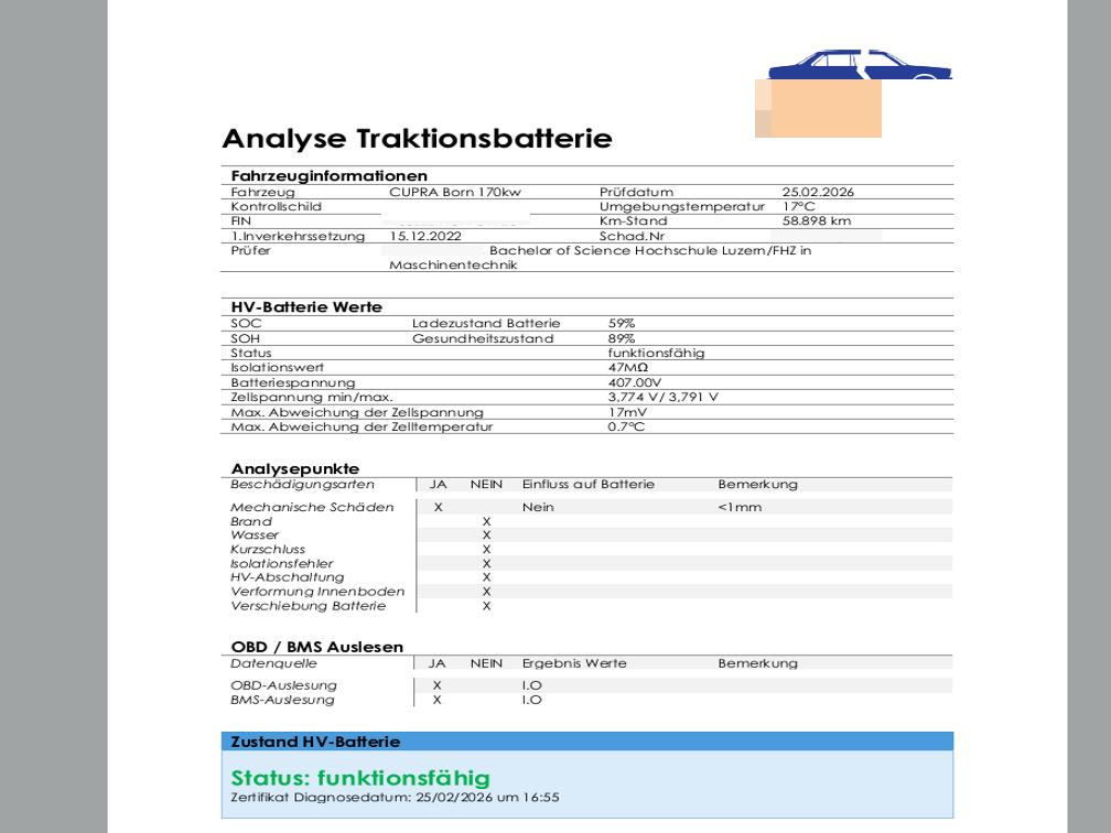 Die HV-Batterie wurde geprüft und ist funktionsfähig.Das Fahrzeug wird mit der HV-Batterie verkauft.Die (vom Fahrzeugexperten) ermittelten Reparaturkosten beziehen sich auf das versicherte Ereignis. Allfällige zusätzliche, nicht versicherte Schäden/Vorschäden, sind in den Reparaturkosten nicht enthalten. Die deklarierten Ausstattungsmerkmale können von der effektiven Ausstattung abweichen.AchtungBei einem Hochvoltsystem - Spannungsfreiheit prüfen. Sicherheitshinweise und Betriebsanleitungen des Herstellers konsultieren und befolgen.