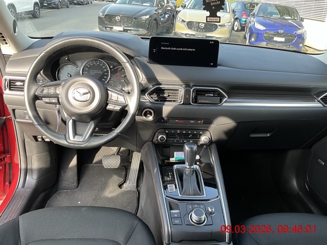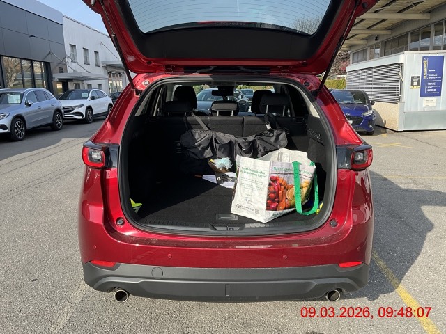 3-Punkt-Sicherheitsgurte auf allen Plätzen, Airbag: Airbag Fahrer und Beifahrer, Airbag: Seitenairbags vorne, Airbag: Vorhang vorn-hinten, Alarmanlage, Assist: Adaptive Geschwindigkeitsautomatik MRCC (Mazda Radar Cruise Control), Assist: Antiblockiersystem (ABS), Assist: Antriebsschlupfregelung (ASR), Assist: City-Notbremsassistent SCBS mit Fussgängererkennung, Assist: Dynamische Stabilitätskontrolle DSC und Traktionskontrolle TCS, Assist: Einparkhilfe mit Parksensoren vorn und hinten, Assist: Elektronische Parkbremse mit Auto-Hold-Funktion und Berganfahrhilfe, Assist: Pre-Crash Safety mit aktivem Bremseingriff SBS (Smart Brake Support), Assist: Rückfahr-Querverkehrs-Notbremsassistent RCTA (Rear Cross Traffic Brake), Assist: Rückfahrkamera, Assist: Spurhalteassistent LAS (Lane-keep Assist System) mit aktiver Lenkunterstützung, Assist: Spurwechselassistent (BSM, Blind Spot Monitoring) mit Totwinkelwarner, Assist: Stauassistent (CTS, Cruising &, Assist: Tempomat, Aussenspiegel elektrisch verstellbar, beheizbar und automatisch einklappbar, Aussenspiegel in Wagenfarbe, Blenden im Seitenfensterbereich in Brilliant Black, Bordcomputer, Dachheckspoiler in Wagenfarbe, Drehzahlmesser, Dunkel getönte Scheiben hinten (Privacy Glass), Elektrische Fensterheber vorn und hinten mit Automatikfunktion, Fahrwerk: G-Vectoring Control Plus, die Fahrdynamikregelung von Mazda, Fahrwerk: Mi-Drive (Mazda Intelligent Drive Select) mit Sportmodus, Fahrwerk: Mi-Drive (Mazda Intelligent Drive Select) mit Sportmodus und Offroad-Modus, Garantie: Mazda Garantie 3 Jahre oder 100'000 km (ab 1. Inv.), Getriebe: 6-Stufen-Automat sequentiell, Heckscheiben-Wisch-/Waschanlage, Innenspiegel mit automatischer Abblendung, Isofix-Kindersitzverankerungen (2x), Karakuri-Gepäckraumabdeckung, Katalysator geregelt, Klima: 2-Zonen-Klimaautomatik mit Ventilation hinten, Kühlergrill in Brilliant Black, LED Innenraumbeleuchtung, Lackierung: Uni-Lackierung, Lederlenkrad und -schaltknauf, Lenkrad: Lenkrad längs- und höhenverstellbar, Lenkrad: Lenkradschaltwippen, Lenkrad: Multifunktionslenkrad, Licht: Adaptives Matrix-LED-Lichtsystem ALH (Adaptive LED Headlight) inkl. Fernlichtautomatik, Licht: Drittes Bremslicht, Licht: LED-Lichtsignatur vorn und hinten, Licht: LED-Rückleuchten, Licht: LED-Tagfahrlicht integriert in Scheinwerfer, Licht: Lichtautomatik, Licht: Nebelschlussleuchte, Licht: Scheinwerfer mit Coming-/Leaving-Home-Funktion, Media: 2 USB vorne und hinten, Media: Apple CarPlay und Android Auto, Media: Audiosystem mit DAB+-Radio, 2x USB, AUX- und 12V-Anschluss, Media: Bluetooth für Mobiltelefone und Audiogeräte, Media: Head-up-Display mit Projektion auf die Windschutzscheibe, Media: Mazda Connect mit 8''- Touchscreen, Media: Multi Commander HMI auf der Mittelkonsole, Media: MyMazda App, Media: Navigationssystem, Mittelarmlehne hinten mit 2 Getränkehaltern, Motor-Startknopf, Paket: Tech Pack, Paket: Winter pack, Polster: Stoff-Ausstattung, Räder: Reifendruckkontrollsystem, Räder: Reifenreparatur-Set (Tire Fit), Scheibenwischer mit Regensensor, Servolenkung geschwindigkeitsabhängig, Shark-Fin-Antenne in Wagenfarbe, Sitze: Fahrersitz mit einstellbarer Lendenwirbelstütze, Sitze: Rücksitzlehnen 40 : 20 : 40 abklappbar (ebene Ladefläche), Sitze: Rücksitzlehnen 40 : 20 : 40 abklappbar mit einem Handgriff abklappbar (Karakuri), Sitze: Rücksitzlehnen in der Neigung verstellbar, Sitze: Vordersitze höhenverstellbar, Wegfahrsperre elektronisch, Zentralverriegelung mit Fernbedienung, i-stop, das intelligente Stopp-Start-System von Mazda