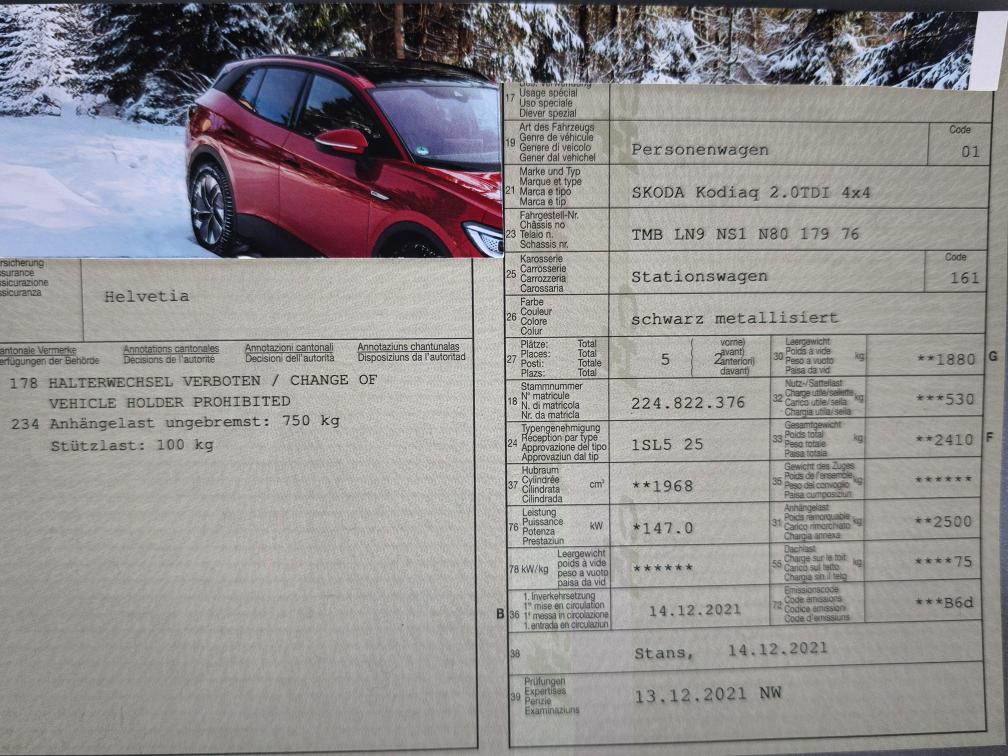 - Sehr gepflegter Skoda Kodiaq - Service 10.2025 / 60'000Km - 8-fach bereift Alu - Dachträger mit Skiträger dazu Es wurde keine Werkstatt-Test durchgeführt ab Platz, ohne Garantie und Nachwährschaft