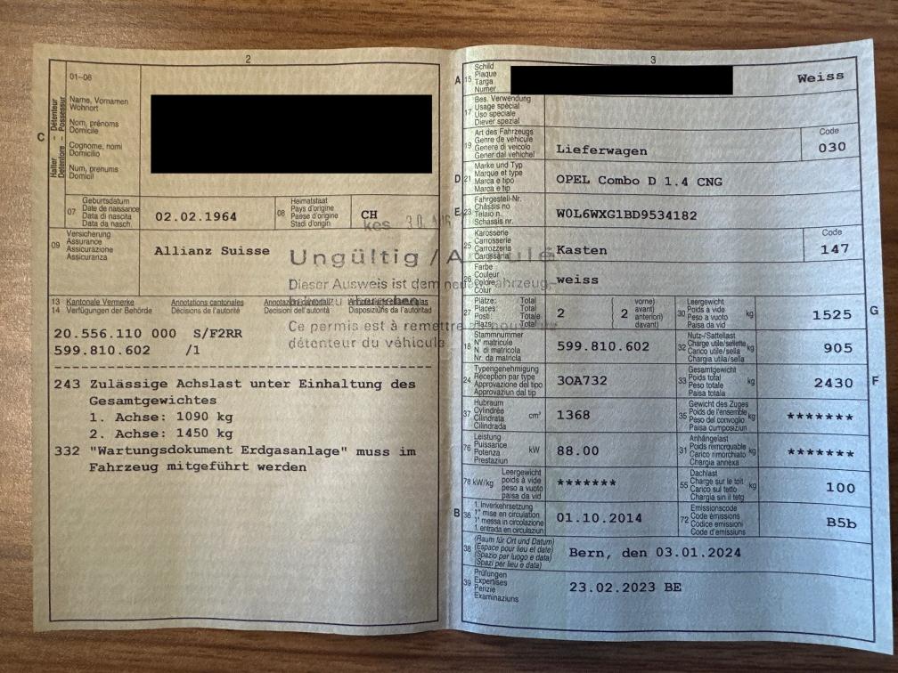 Opel Combo D 1.4 CNG Turbo – Wenig KM – Ab Platz Verkaufe einen Opel Combo D 1.4 CNG (Jg. 2014) aus Eintausch. Mit nur 98'765 km hat das Fahrzeug eine sehr geringe Laufleistung für sein Alter. Der Wagen ist mit dem sparsamen Erdgasantrieb (Turbo) ausgestattet und ideal für Gewerbe, Export oder als günstiges Projektfahrzeug. Zustand & Details • Kilometer: 98'765 km • Batterie: Neu verbaut (vor kurzem ersetzt). • Wartung: Letzter Service & MFK waren am 23.02.2023. • Technischer Zustand: Das Fahrzeug wurde keiner aktuellen technischen Kontrolle unterzogen. Es wird im Ist-Zustand verkauft. • Optik: Dem Alter entsprechende Gebrauchsspuren wie Dellen und Kratzer (siehe Fotos). • Verkauf erfolgt „ab Platz“ und ohne jegliche Garantie oder Gewährleistung