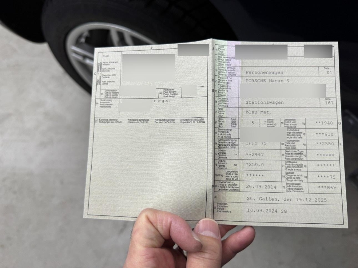 Wegfahrsperre elektronisch, Nebelscheinwerfer, Lenkrad: Multifunktionslenkrad mit Schaltwippen, Bordcomputer, Handschuhfach gekühlt, Lenkrad: Lenkrad längs- und höhenverstellbar, Mittelkonsole mit Ablagefach, Dachhimmel, Airbag: Airbag Fahrer und Beifahrer, Licht: Drittes Bremslicht LED, Sitze: Rücksitzlehne geteilt abklappbar, Aussentemperaturanzeige, Auto Start-Stop-Funktion, Pollenfilter (Staubfilter), Bremsassistent (BAS), Auspuffanlage mit 2 Endrohren, Räder: Reifendruckkontrollsystem ( RDK ), Airbag: Thorax Seitenairbag für Fahrer und Beifahrer, Audiosystem CDR Plus, Elektronische Parkbremse, Regensensor für Scheibenwischer vorne, Licht: LED-Tagfahrlicht, Klima: 2-Zonen-Klimaautomatik, Antiblockiersystem (ABS), Wartungsintervall-Anzeige, Aktivkohlefilter (Geruchsfilter), Assist: Seitenaufprall-Schutzsystem, Beleuchtetes und abschliessbares Handschuhfach, Katalysator geregelt, Airbag: Airbag Beifahrer deaktivierbar, Sitze: Komfortsitze vorne elektr. verstellbar, Mittelarmlehne hinten, Einstiegsschienen mit Logo, Ablagen in den Türen, Lenkrad: Sportlenkrad, Aussenspiegel rechts und links beheizt, elektrisch verstell- / und einklappbar, Heckklappe automatisch, Scheibenwischer vorne mit Intervall, Licht: LED Heckleuchten, Tempomat mit Geschwindigkeitsbegrenzer, Wärmeschutzverglasung, Gurtstraffer vorne, Höhenverstellbare Gurten vorne, Räder: Reifenreparatur-Set mit Kompressor, Airbag: Seitenairbags, Lackierung: Uni-Lackierung, Sequentielles 7-Gang-Getriebe mit Automatikfunktion, Steckdose 12V, Heckscheibenheizung, Zentralverriegelung mit Fernbedienung, Ablagefach im Kofferraum, Bremssättel lackiert, Bremsbelag-Verschleissanzeige, 4 Leichtmetallfelgen 18J mit Pneu, Leseleuchten, Licht: LED Blink- und Positionsleuchten, Licht: Fahrlichtassistent (automatisches Fahrlicht), Allradantrieb permanent, Stoff-/Alcantara-Ausstattung, Airbag: Curtain Airbag, Licht: Nebelschlussleuchte, Elektrische Fensterheber vorne + hinten mit Komfortschliessung, Cupholder vorne und hinten, Heckscheiben-Wisch-/Waschanlage, Fahrstabilisierungssystem Porsche - Stability-Management (PSM), ISOFIX Kindersitzvorrichtung, Vorbereitung für Anhängevorrichtung, Laderaumabdeckung, Multifunktionsanzeige