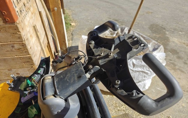Elektro-Deichselstapler mit 2000 kg Hubkraft Deichsel mit Handteil deformiert Not-Schalter, Kunststoff-Abdeckung oben gebrochen