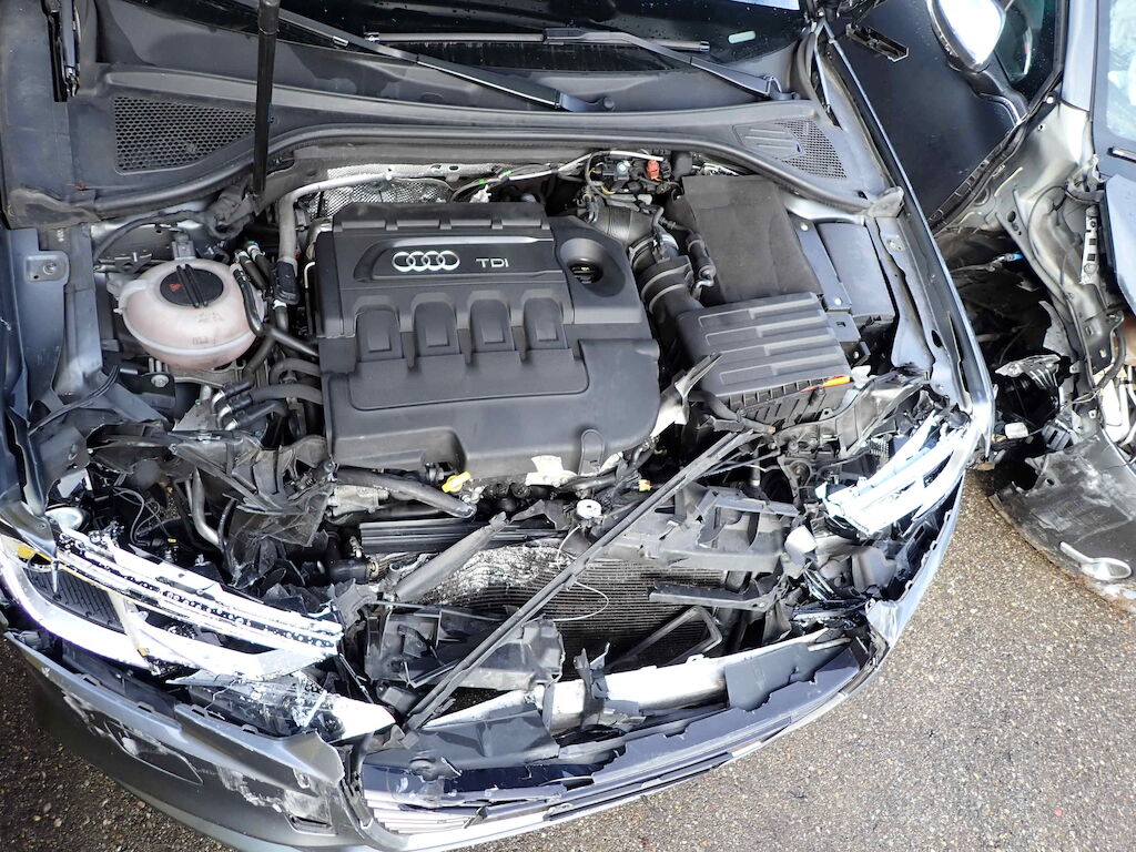 massiver Frontschaden: ganze Front, Kühlerpaker, Motor steht schräg, Frontscheibe beschädigt, div. Airbags und Gurtstraffer ausgelöst Motor Getriebe Vorderachse Hinterachse Airbags ausgelöst: 6 unbekannt ( Abfallcode 16.01.04ak )