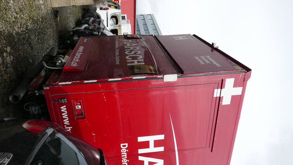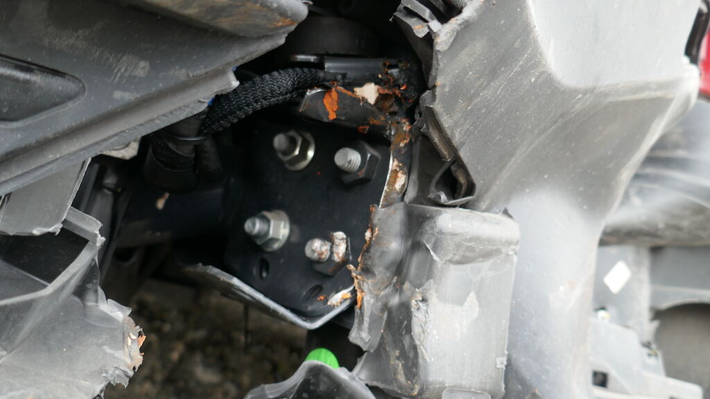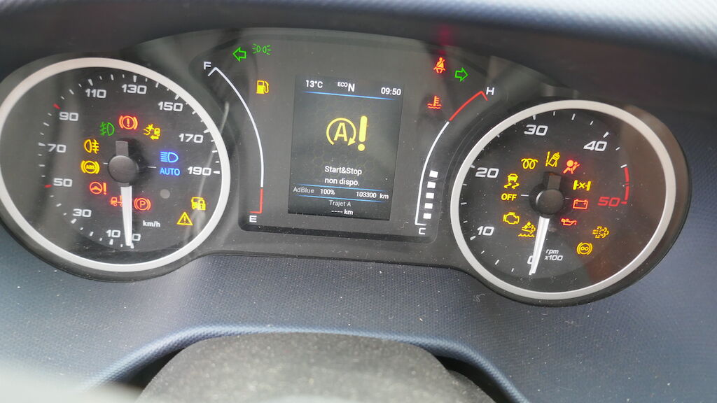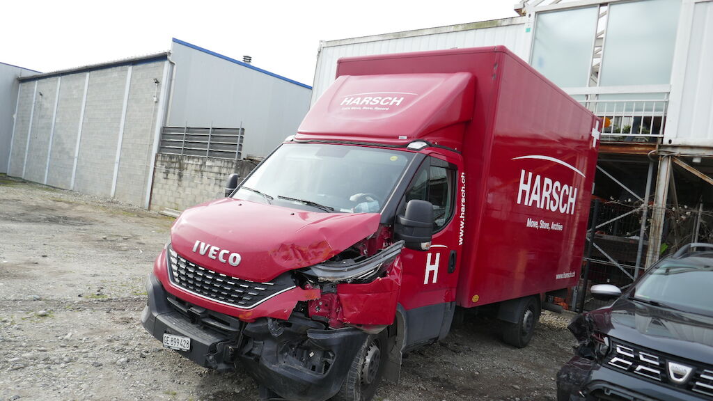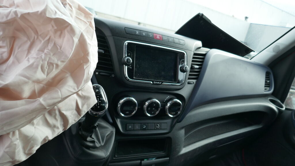 Violent choc avant gauche : pare-chocs avant gauche et central, supports, guides, calandre, cache de calandre, phare avant gauche, capot, charnière gauche de capot, serrure de capot, aile avant gauche, porte avant gauche, tablier, renfort de tablier, joue d'aile avant gauche, montant A avant gauche, montant B arrière gauche, radiateur, condenseur, traverse inférieur, fermeture de longeron avant gauche, masque, filtre à air, support de boite à fusible enfoncés, déformés, éraflés, contraints, brisés. Caisse de transport complétement décalée, partiellement arrachée du faux châssis, faux châssis endommagé. Traverse arrière de la caisse déformée arrachée. Airbag conducteur et ceinture conducteur déployés, tirés. Risque sur longeron. Motor Getriebe Vorderachse Hinterachse Airbags ausgelöst: 1 unbekannt ( Abfallcode 16.01.04ak )