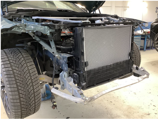 Beschreibung der Schäden: Stossfänger, Haube, Frontscheibe, beide Kotflügel, Scheinwerfer L+R, Querträger, Kühler, Schlossträger, deformiert. Rad mit Pneu VR beschädigt. Keine Gurten / Airbags ausgelöst. Innenraum Infodisplay beschädigt. Holmen VR deformiert Hochvoltsystem zeigt "Ready" an. Verschmutzung im Innenraum Sitz Beifahrer.