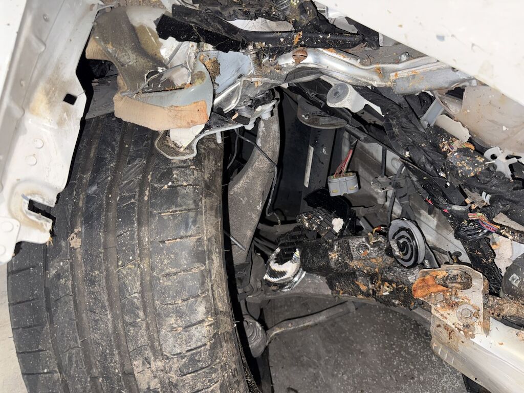 Front- und Seitenschaden links: Front rechts eingedrückt bis zur Vorderachse. Vorderachse mit Träger und Lenkung beschädigt. Beide Türen links eingedrückt und Seitenwand hinten stark eingedrückt. Aufzählung nicht abschliessend. Motor konnte nicht gestartet werden. Motor Getriebe Vorderachse Hinterachse Airbags ausgelöst: 3 unbekannt ( Abfallcode 16.01.04ak )