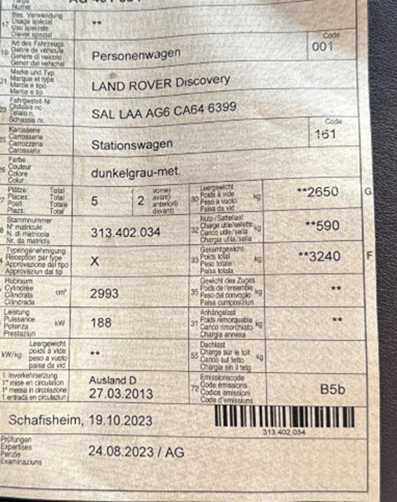 Gebrauchsspuren Karosserie Aussen inkl. auf der Lackierung Harz siehe Fotos Starke Gebrauchsspuren im Innenraum siehe Fotos Aussenrückspiegel rechts wurde mal angefahren siehe Foto Wassereintritt / Starker Geruch im Fahrzeug Lautsprecherblende hinten links defekt siehe Foto Scheibe hinten rechts weist Kratzer auf siehe Fotos 2 Schlüssel vorhanden / aber nur 1 Schlüssle hat eine Klinge Sporadischer Schlüsselfehler / Verdacht auf fehlerhafter Schlüssel oder Antenne Letzter Service / Reparatur anhängen Keine AHK – nur Stützlast KEIN COC vorhanden Fotos von allen Schäden Keine andere Bereifung Am Fahrzeug wurde keine vollumfängliche Prüfung der mechanischen Teile und der Carrosserie durchgeführt! Das Risiko liegt somit vollumfänglich beim Käufer. Um Missverständnisse zu vermeiden kann das Fahrzeug auf Voranmeldung besichtigt & getestet werden. Wird davon bewusst kein Gebrauch gemacht, liegt die Verantwortung beim Käufer. Nach Zuschlag, keine Nachverhandlungen möglich. Ab Platz ohne Garantie, Wandelung und Minderung werden wegbedungen