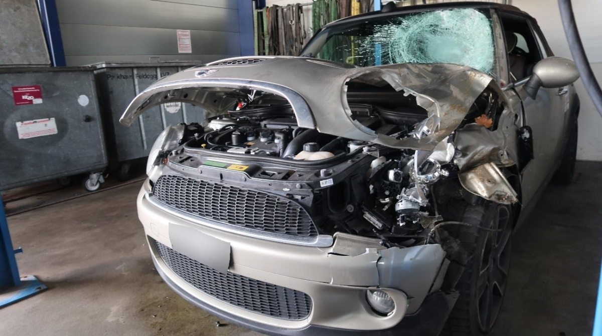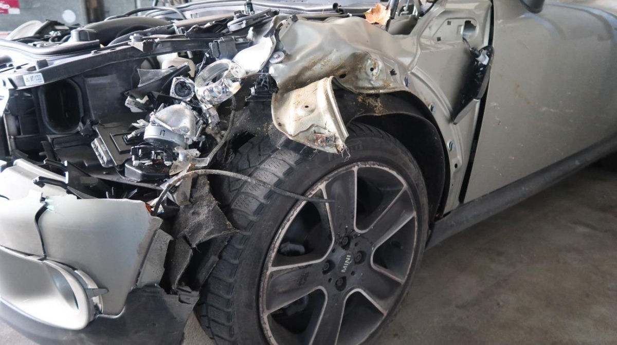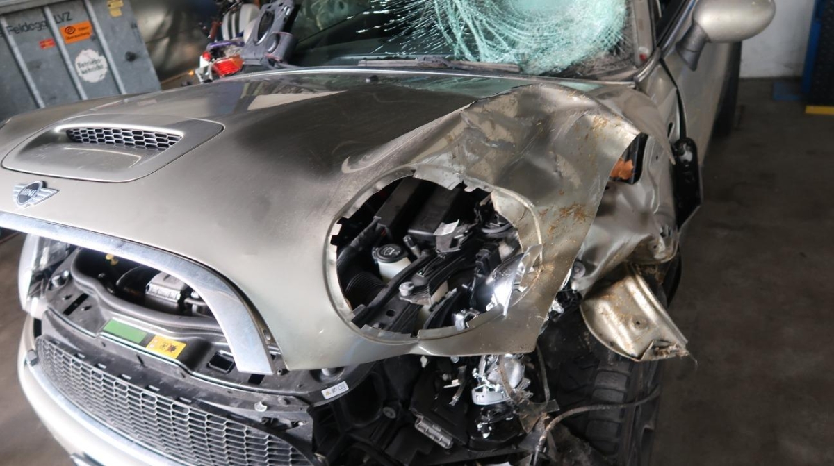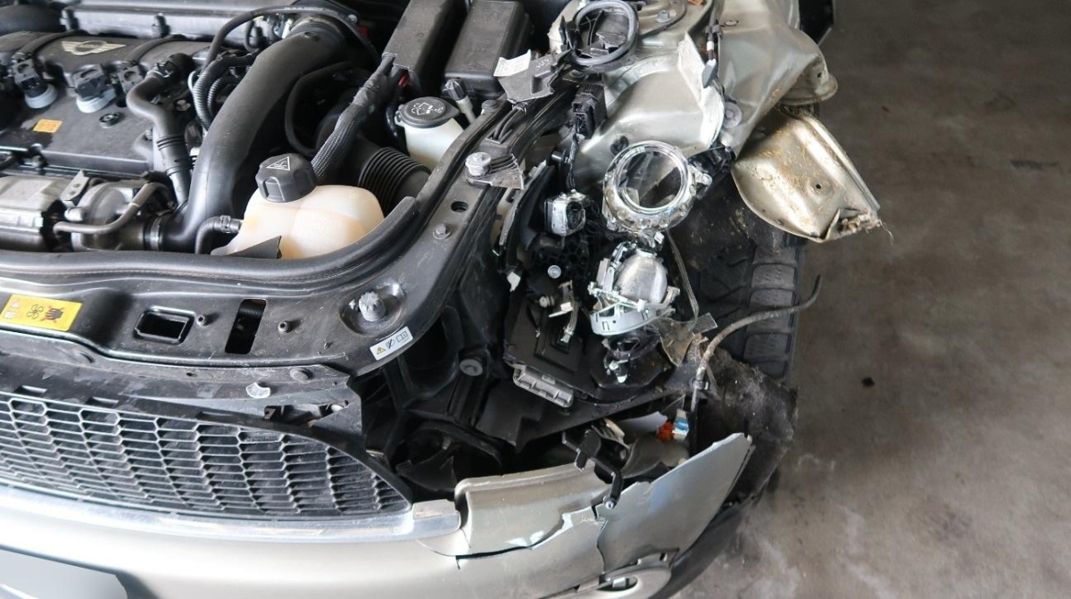 A-Säule, Achsträger, Federbein vorne links, Front, Front links, Frontblech, Frontscheibe, Klimakühler, Kotflügel links, Kotflügel rechts, Kühler, Kühlgitter, Lenkung, Längsträger vorne links, Motorhaube, Motorträger, Querträger, Rad hinten links, Rad hinten rechts, Rad vorne links, Rad vorne rechts, Radaufhängung vorne links, Radhaus vorne links, Scheinwerfer links, Scheinwerfer rechts, Schlossträger, Schweller links, Stosstange vorne, Türe vorne links, Vorderachse
