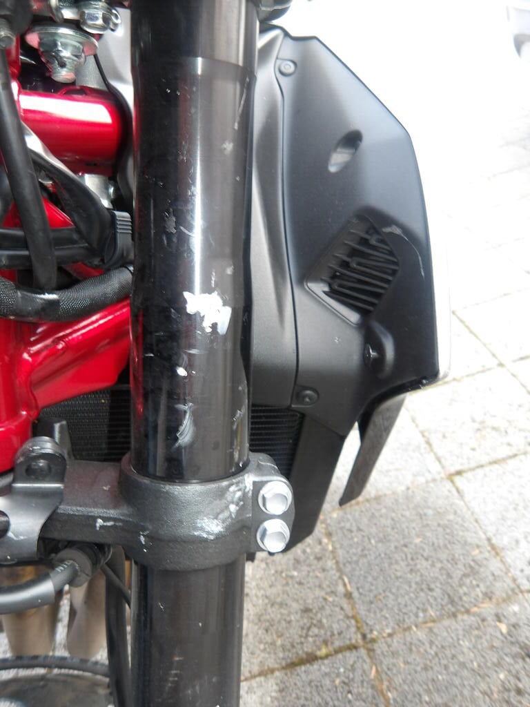 toute la partie avant est endommagée et perte de liquide venant du moteur, carénages, feu, fourche, garde-boue, jante avant, radiateur de refroidissement moteur, une bosse sur le réservoir Motor Getriebe Vorderachse Hinterachse Airbags ausgelöst: 0 Nein ( Abfallcode 16.01.04ak )