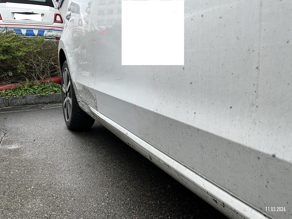 Seite rechts : Stossfänger vorne gerissen, Scheinwerfer zerschlagen, Motorhaube eingedrückt, Kotflügel geknickt, Türe vorne eigedrückt/zerkratzt, Türe hinten eingedrückt/zerkratzt, Schweller eingedrückt/zerkratzt, Felge hinten zerkratzt - AUFZÄHLUNG NICHT ABSCHLIESSEND / Vorschaden: Hagelschaden, Stossfänger hinten links zerkratzt