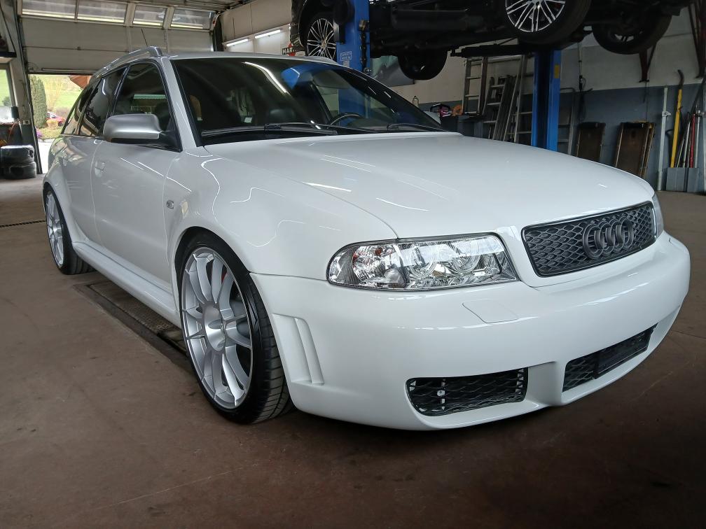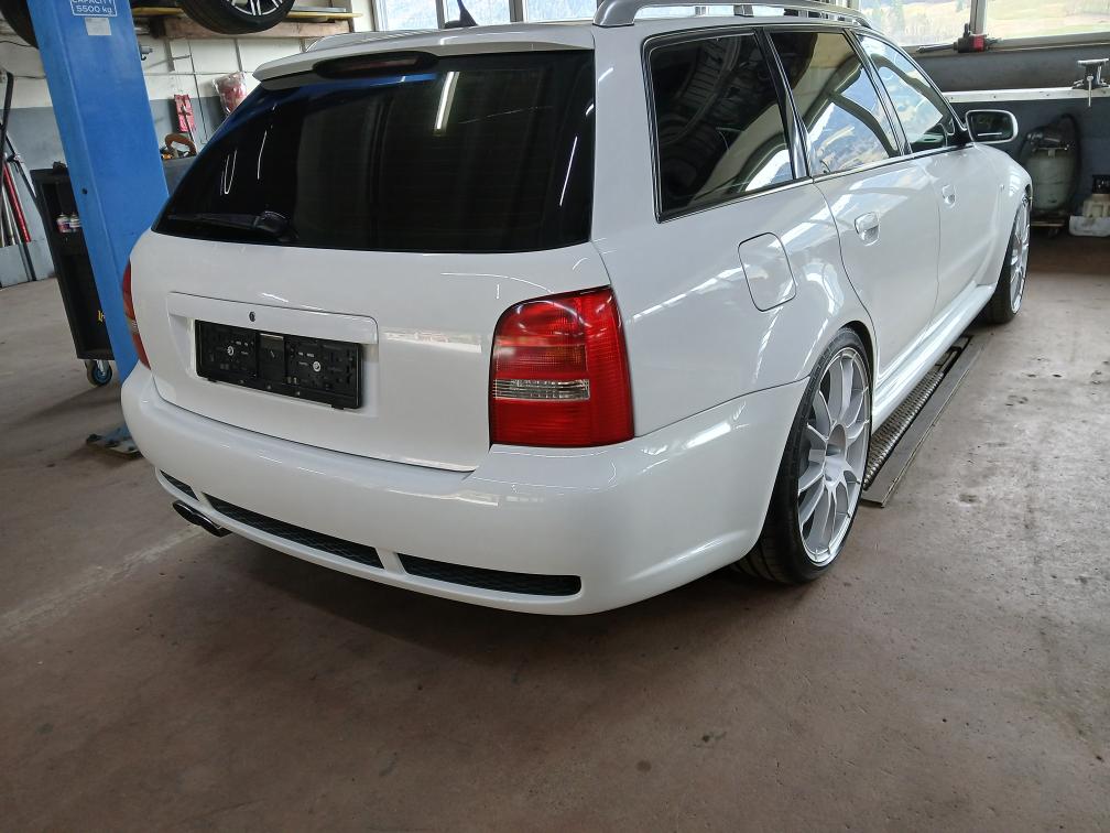 Rumpfmotor ist vom Audi S4 alle Anbauteile RS4, Viele Neuteile wie Turbolader, Abgaskrümmer, Pleuel, Motorlagerschalen. Sekundärluftsystem ist aus Codiert. Wagner LLK, Saugerköpfe mit Nockenwellen, Neue Kupplung mit Schwungrad verstärkt. ( Leistung nicht eingetragen ) anhand der Anbauteile sollte er über 500PS haben. Bremsen vorne und hinten Neu, Felgen wie Reifen Neu, Zahnriemen und WP ersetzt. Alle Querlenker voren ersetzt. Original Farbe Silber. Verkauf ab Platz ohne Garantie