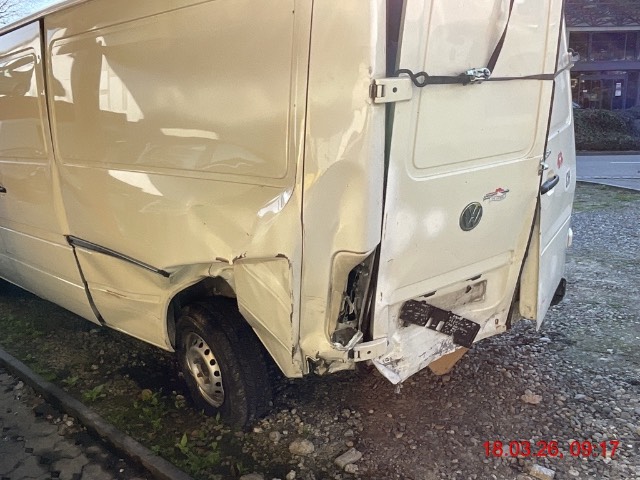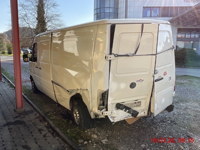 Heck links stark eingedrückt, Seitenwand links gestaucht, Schiebetür links gestaucht, Chassis hinten geknickt, Hinterachse verzogen, Reifen vorne rechts und hinten links beschädigt. Aufzählung nicht abschliessend / Vorbestandene Schäden: gem. Fotos