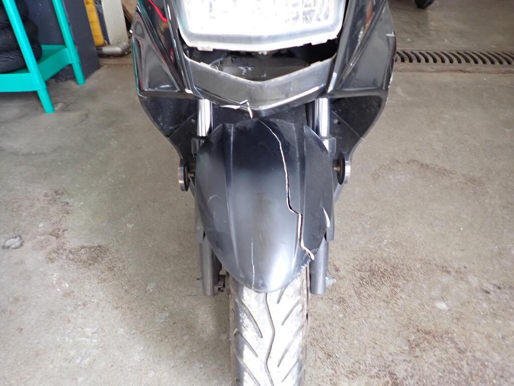 Véhicule entièrement endommagé Le véhicule ne peut pas rouler. Côté gauche et droit, roue avant, fourche endommagés. Gardeboue avant défectueux. Risques sur le moteur. Cadre voilé et endommagé