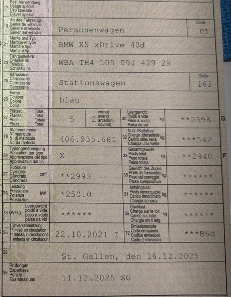 Der X5 bietet eine perfekte Mischung aus Sportlichkeit, Komfort und Alltagstauglichkeit. Dank der hochwertigen Verarbeitung, der modernen Technik und der grosszügigen Platzverhältnisse ist er sowohl für lange Reisen als auch für den täglichen Einsatz ideal geeignet. Fahrzeugdaten • Marke / Modell: BMW X5 xDrive40d • Erstzulassung: 22.10.2021 • Motor: 3.0 Diesel • Leistung: 340 PS / 250 kW • Hubraum: 2993 cm³ • Antrieb: xDrive Allrad • Karosserie: Kombi / SUV • Farbe: Blau • Sitzplätze: 5 • Leergewicht: 2398 kg • Gesamtgewicht: 2940 kg • Emissionsnorm: Euro 6d Sehr gepflegtes Fahrzeug. Sauber innen und aussen Keine Nachverhandlungen vorort