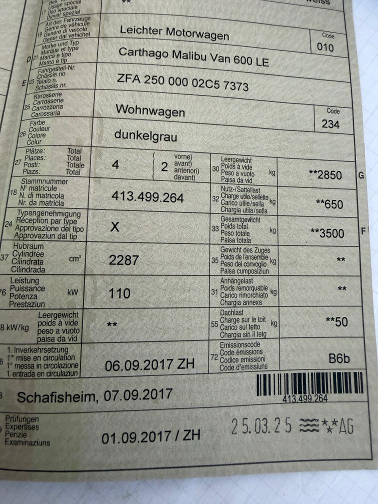 Sehr gepflegter Camper. Geeignet für 2 Personen. Zahnriemen müsste ersetzt werden vom Alter her. Wartungsdienst mit Oel und Filter sowie Bremsflüssigkeit sollte ausgeführt werden. Reifen sind von 2017. Profil ist Ok. Gastest Dokument vorhanden. Es wurde kein Partikelfiltertest gemach da Kunde seit letzter MFK keine 500 Km mehr gefahren ist. Auspuff ist sauber. Top Ausstattung, Markise, Zenec Navigation, Heckveloträger, Chassi Paket mit Manueller Klimaanlage, Rückfahrkamera, Kuschelwelt. Am Fahrzeug wurde kein Werkstatttest gemacht (Für sichtbare oder nicht sichtbare Mängel wird nicht gehaftet). Wir testen und prüfen nicht alle Funktionen vom Fahrzeug. Das Risiko liegt somit vollumfänglich beim Käufer. Nach erhalt des Zuschlags, gibt es keine Nachverhandlung, auch wenn nicht deklarierte Mängel zum Vorschein kommen. Ab Platz ohne Garantie oder Gewährleistung, Wandelung und Minderung werden wegbedungen