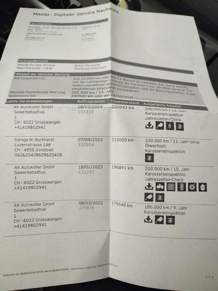 Sehr gepflegt aussen wie Innen Zwei mal Jaehrlich Oel wechsel gemacht Letzter Oelwechsel 16.12.2025 bei 239500km Automat schaltet einwandfrei Sommerräder sind Original Mazda Winterräder Beiblatt vorhanden