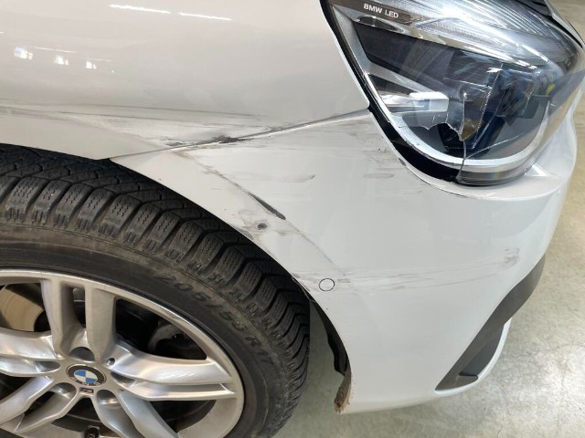 Stossstange vorne und hinten, Scheinwerfer, Türen und Kotflügel sind beschädigt.