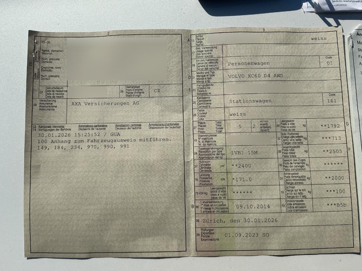 Aussentemperaturanzeige, Laderaumrollo, Antiblockiersystem (ABS), Tempomat, Licht: Nebelschlussleuchte, Start-/Stop-Knopf, Staufach hinter Mittelkonsole, Dachspoiler, Armlehne vorne mit Ablagefach, Blinker in Aussenspiegel, ISOFIX-Befestigungspunkte für Kindersitz an den äusseren Rücksitzen, Bordcomputer, Mittelarmlehne hinten mit Fach und Cupholder, Aussenspiegel rechts und links beheizt und elektrisch verstellbar, asphärisch gewölbtes Spiegelglas, Leseleuchten vorne, Dynamische Stabilitäts- und Traktions- kontrolle DSTC, Allradantrieb permanent, Polster: Komfortsitze mit Lederpolster - Polsterung / Armlehnen, Dachhimmel, u. Teil Armaturentafel, Türverkleidung, Türverkleidungseinsatz, Teppich / Textilfussmatten / Tunnel, Kreuzstützen für Vordersitze verstellbar, Lenkrad: Sicherheitslenksäule, Stossfänger, Radhausverbreiterung und Schutzleisten in robustem Kunststoff, Innenspiegel automatisch abblendbar, Lenkrad: Multifunktionslenkrad in Leder, Partikelfilter und Oxydationskatalysator, Abschliessbares Handschuhfach, Schleudertrauma-Schutzsystem (Backguard), Servolenkung, Verbandskasten, Gepäckraum Schutzschwelle aus Aluminium, 3 Kopfstützen hinten, Schalthebelknauf in Leder, Steckdose 12V, Wegfahrsperre elektronisch, Automatische Parkbremse, Fahrersitz elektrisch verstellbar mit Memory, Seitenaufprall-Schutzsystem, Airbag: Airbag Fahrer und Beifahrer, Klima: Klimatisierungsautomatik, Airbag: Kopf -/ Schulterairbag, Beide Make up-Spiegel beleuchtet, IDIS (Intelligent Driver Information System), Digitale Instrumentierung, Sitze: Elektrisch einstellbare Lendenwirbelstütze für Vordersitze, Licht: Adaptives Bremslicht, Fahrer-Informationssystem, Airbag: Seitenairbags für Fahrer und Beifahrer, Fussraumbeleuchtung vorne, Höhenverstellbare Gurten vorne, Überrollschutzsystem ROPS, Räder: Reifenreparatur-Set mit Kompressor, Gurtkontrolle, Komfortschliessanlage mit Funk-Fernbedienung, Antibeschlagsensor, Sitze: Rücksitzlehne geteilt abklappbar, Anhänger Stabilisierungkontrolle TSA, Dachreling in Aluminium, Lederlenkrad Off Black, Cupholder, Frontscheibe Verbundglas, Gurtstraffer vorne und hinten, Mittelkonsole in Alu, Aktivkohlefilter mit automatischer Umluftschaltung, Durchtauchschutz auf allen Sitzplätzen, Mittelkonsole mit Ablagefach, Elektrische Fensterheber vorne + hinten, 6-Stufen-Automat Geartronic, Audiosystem Sensus High PerformanceSound Radio/CD-Player,(MP3 / WMA), 5-Zoll-Farb monitor, 4 x 50W, 8 Lautsprecher, Innenlicht-Abschaltverzögerung, Aussenspiegel elektrisch einklappbar inkl. Bodenbeleuchtung, Sitze: Vordersitze höhenverstellbar, Leseleuchten hinten, 3-Punkt-Sicherheitsgurte auf allen Plätzen, Aktive Stabilitätskontrolle (RSC), Assist: Bremsassistent (BAS), Zusatzheizung, Fahrwerk: Dynamisches Fahrwerk, Regensensor für Scheibenwischer vorne, Colorverglasung, City Safety automatische Notbremsung bis zu einer Geschwindigkeit von 50 km/h, Licht: Drittes Bremslicht, Chromapplikationen an den Bedienknöpfen, Zentralverriegelung mit Fernbedienung und automatischer Türverriegelung, Leichtmetallräder PAN 7,5x18J, Wegbeleuchtung, Assist: Einparkhilfe hinten, AUX-Eingang in der Mittelkonsole, LED-Tagfahrlicht