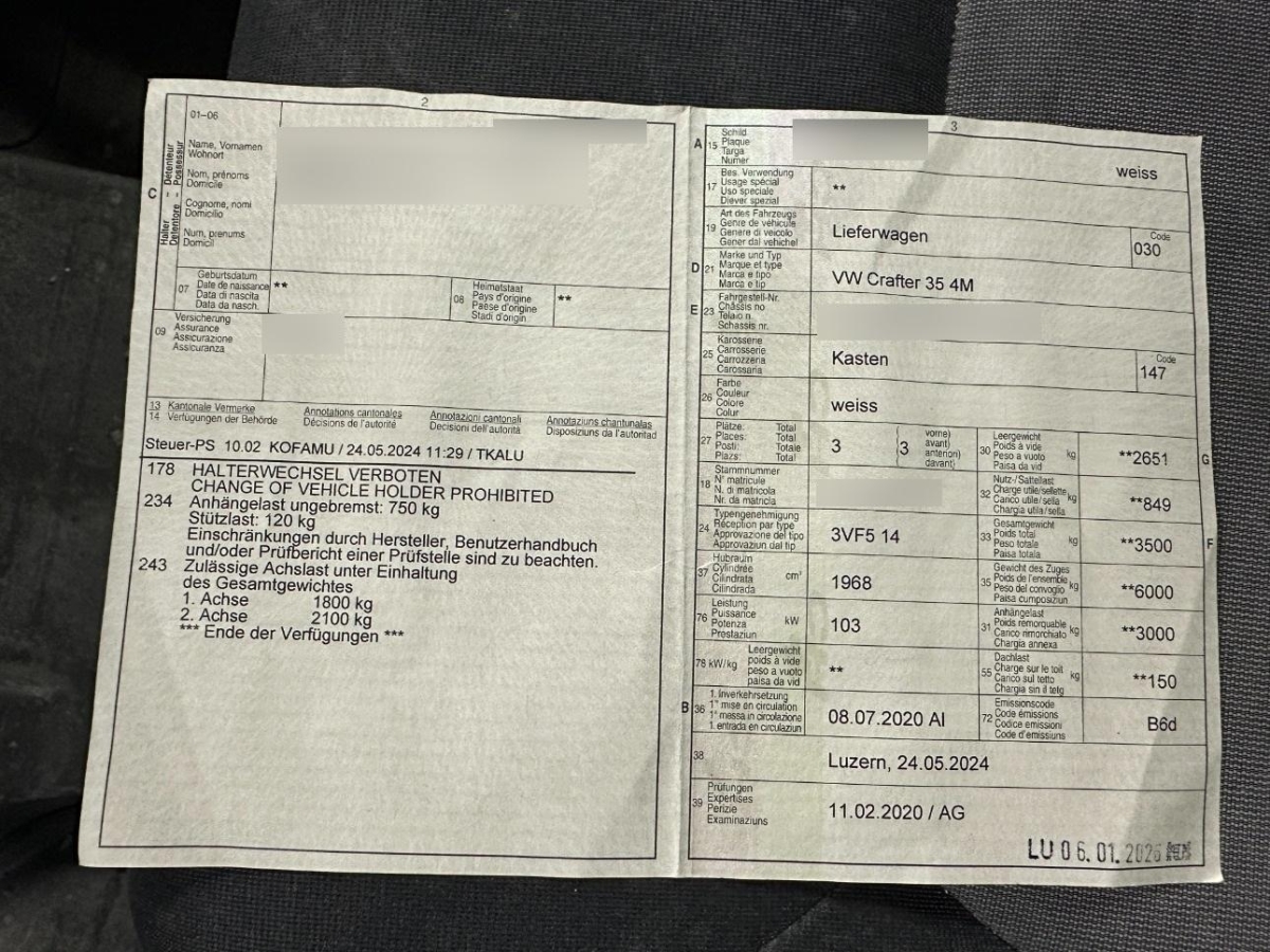 Licht: Drittes Bremslicht, Stossstangen vorne in Grau, Scheibenwischer vorne mit Intervall, Uni-Lackierung, Licht: Nebelschlussleuchte, Flügeltüren hinten 180°, verglast, Gurtstraffer vorne, LED Blinker im Aussenspiegel, Laderaumtrennwand mit Fenster, Leuchtweitenregulierung von innen, Elektronisches Stabilitäts-Programm (ESP), Radnabenabdeckung, Abschleppöse vorn, Einstiegsgriff A-Säule, Ablage im Armaturenbrett, Türen: Schiebetüre rechts, Stahlräder 16J, Trittstufe in Frontstossstangen, Verzurrösen, Partikelfilter und Oxydationskatalysator, Ablagen in den Türen, Dachgalerie, Airbag Fahrerseite, Lenkrad längs- und höhenverstellbar, Lenkradsperre, Drehzahlmesser, Elektrische Fensterheber vorne, Stoff-Ausstattung, Kühlergrill unlackiert mit einer Chromleiste, Sommerreifen, Antiblockiersystem (ABS), Ohne Höchstgeschwindigkeitsbegrenzung auf maximal 90 km/h, Stop/Start-Technologie, Elektrische Klemmleiste, 6-Gang-Getriebe, Innenbeleuchtung im Laderaum, 17" Scheibenbremsen vorn und 16" Scheibenbremsen hinten, Berganfahrassistent, Ohne Nebenantrieb von Getriebe, Handschuhfach, 4 Scheibenbremsen, Ohne Höchstgeschwindigkeitsbegrenzung auf maximal 90km/h, Wärmeschutzverglasung, Allradantrieb permanent, 12-V Steckdosen im Armaturenbrett (2x), Sicherheitsgurte auf allen Plätzen, Digital Uhr, Heckscheibenheizung, Gummiteppich im Fahrerhaus, Zentralverriegelung mit Fernbedienung, Tageskilometerzähler, 2 Einzelsitze vorne, Innenspiegel abblendbar, Reifenreparatur-Set (Tire Fit), Hochdach in Wagenfarbe, Wegfahrsperre elektronisch, 2 Lautsprecher, Radio Composition Audio, Innenleuchten LED, 2. Schlüssel mit Funkfernbedienung, Cupholder, Seitenschutz-Zierleisten, Assist: Seitenwindassistent, Cupholder vorne, Seitliche Markierungsleuchten, Bordwerkzeug, Haltegriffe hinten
