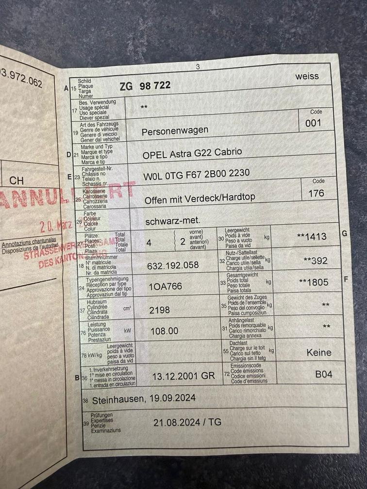 Wir verkaufen diesen Opel im Kundenauftrag: Fahrzeug fährt soweit normal. Ledersitze sind auch noch in gutem Zustand. Tieferlegung ist eingetragen. Auspuff sollte ebenfalls ein Dokument vorhanden sein. Fahrzeug wird mit sehr hoher Wahrscheinlichkeit an den Höchstbietenden abgegeben. Der Kunde hat eine realistische Preisvorstellung. Bekannte Mängel: -Dach funktioniert nichtmehr -Bei laufender Heizung tropft Wasser auf den Fußbodenteppich -Einige Kratzer und Dellen am ganzen Fahrzeug verteilt Verkauf ab Platz. Es wurde kein Werkstatt-Test durchgeführt. Gebotsabgabe auf eigenes Risiko. Keine Nachverhandlungen auch bei eventuell weiteren Mängeln! Muss im Falle einer Zusage innert 4 Werktagen bar bezahlt und abgeholt werden, ansonsten entstehen Standkosten von 30.-/Tag. Spassbieter werden rechtlich belangt!
