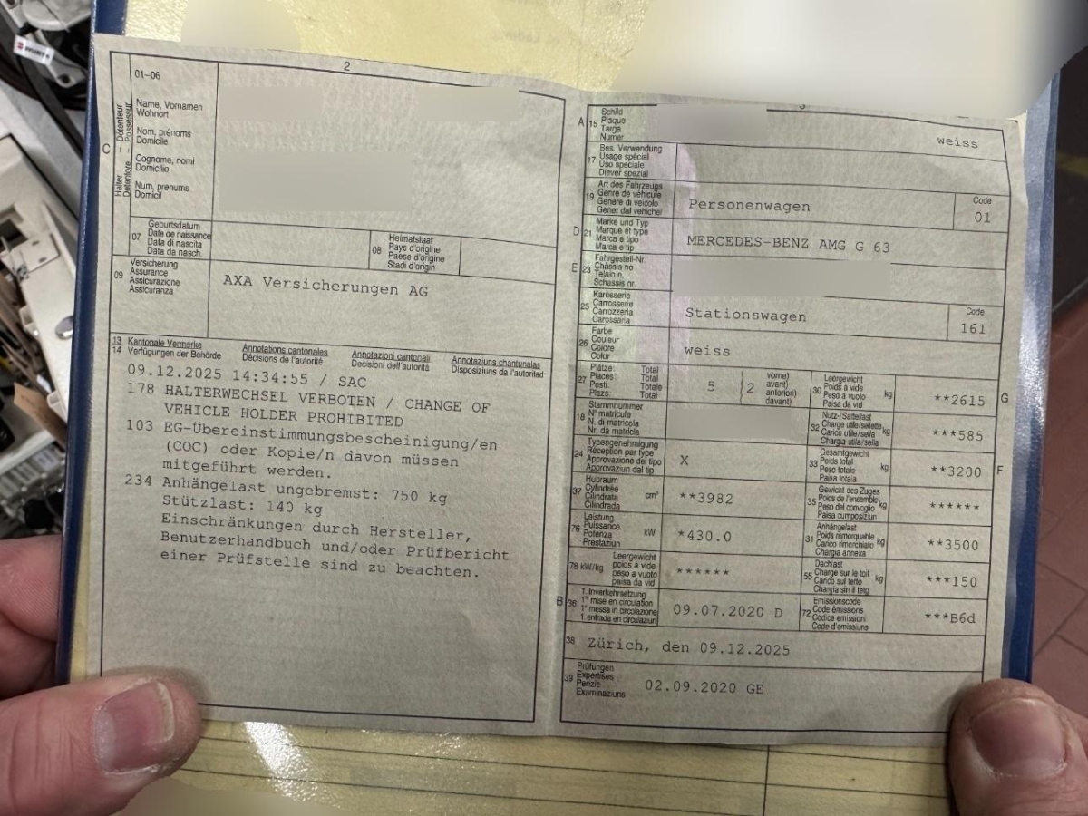 Fahrzeugschlüssel in Schwarz Hochglanz mit Zierrahmen in Mattchrom, Sitze:Vordersitze heizbar, Media:COMAND Online Multimedia-System mit Farbdisplay, Festplatten-Navigation, USB Internet, 6fach DVD-Wechsler, Bluetooth, Handschuhfach verschliessbar, Getriebe:Sequentielles 9-Gang-Getriebe mit Automatikfunktion, Kraftstofftank 100 Liter, Licht:Adaptives Bremslicht, Aussenspiegel rechts und links beheizbar und elektrisch verstellbar, Verbandstasche, Assist:Upfront- und Ueberrollsensorik, Media:Concierge Service, Fahrwerk:Verstelldämpfung, Sitze: Vordersitze elektrisch verstellbar mit Memory, Dekor:designo Klavierlack schwarz, Katalysator geregelt, DYNAMIC SELECT Schalter, ECO Start-Stopp-Funktion, Regensensor für Scheibenwischer vorne, Dekor:Instrumententafel in Leder, Vorrüstung für Bürofunktion im Fahrzeug, Kindersicherung an den hinteren Türen, Sitze:Mittelarmlehne hinten, Sitze:Mittelarmlehne vorne, Paket: AMG Styling-Paket, Media:Smartphone Integration, Getönte Scheiben, Laderaumabdeckung, Media: Kommunikationsmodul (LTE), Media:Digitaler Radioempfang (DAB), Antiblockiersystem (ABS), Servolenkung, Elektrische Fensterheber vorne und hinten mit Komfortbetätigung und Einklemmschutz, G manufaktur Dachhimmel Microfaser DINAMICA, Sitze: Rücksitzlehne geteilt abklappbar, Licht: Innenraumlicht-Paket, Heckscheiben-Wisch-/Waschanlage mit, Zentralverriegelung mit Fernbedienung, Licht: Fahrlichtassistent (automatisches Fahrlicht), Klima:3-Zonen-Komfort-Klimatisierungsautomatik THERMOTRONIC, Dekor:Zierelemente G manufaktur Klavierlack schwarz, Netztrennwand, Assist: Notrufsystem, Airbag: Window-Kopfairbags, Warnweste für Fahrer, Abgedunkelte Seiten- und Heckscheibe, Licht: LED High Performance-Scheinwerfer, Anhängevorrichtung mit Kugelkopf, AMG Veloursfussmatten, KEYLESS GO, Media:Vorrüstung für Navigationsdienste, Sitze: 3 Kopfstützen hinten, Fahrzeug Monitoring, Assist:Spurassistent, Media:Kommunikationsmodul (UMTS), Airbag:Sitzbelegungserkennung für Airbags, AMG Kühlergrill, Räder:AMG Leichtmetallräder im 10-Speichen- Design 20J, titangrau lackiert und glanzgedreht, Lenkrad:AMG Lenkradtasten, Lenkrad:AMG Performance Lenkrad in Leder Nappa, Licht:Ambientebeleuchtung, Allradantrieb permanent, Elektronisches Stabilitäts-Programm (ESP) mit Antriebsschlupfregel ASR, Heckscheibenheizung, Licht:MULTIBEAM LED Scheinwerfer, Assist:ADAPTIVE BRAKE mit HOLD-Funktion, Sitze:Durchlademöglichkeit in der Rücksitzbank, Dekor:Kühlergrill mit Designelementen, Lackierung: Metallic-Lackierung, Paket:Park-Paket mit Rückfahrkamera, Assist: Elektronisches Traktions-System für Allrad (4ETS), Antriebsschlupfregelung (ASR), Airbag: Airbag Fahrer und Beifahrer, Fahrwerk:AMG Hochleistungs-Bremsanlage, Sitze:Rücksitze heizbar, AMG Performance-Abgasanlage, Wärme- und geräuschdämmendes sowie Infrarot reflektierendes Verbundglas rundum, Assist: Verkehrszeichenerkennung, Ablage-Paket, Warndreieck, Widescreen Cockpit, Airbag:Thorax Seitenairbag für Fahrer und Beifahrer, Paket:Konnektivitäts-Paket Komfort, Licht: LED Heckleuchten, Innenspiegel automatisch abblendbar