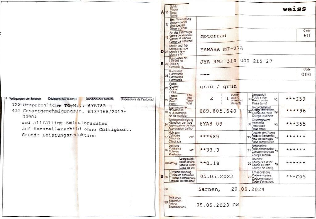 Schaden linke und rechte Seite. Felge hinten, Lenker/Gabel Wenn die Zündung eingeschaltet wird, läuft Benzin über das Motorrad (Benzinpumpe läuft). Motor Getriebe Vorderachse Hinterachse Airbags ausgelöst: 0 unbekannt ( Abfallcode 16.01.04ak )
