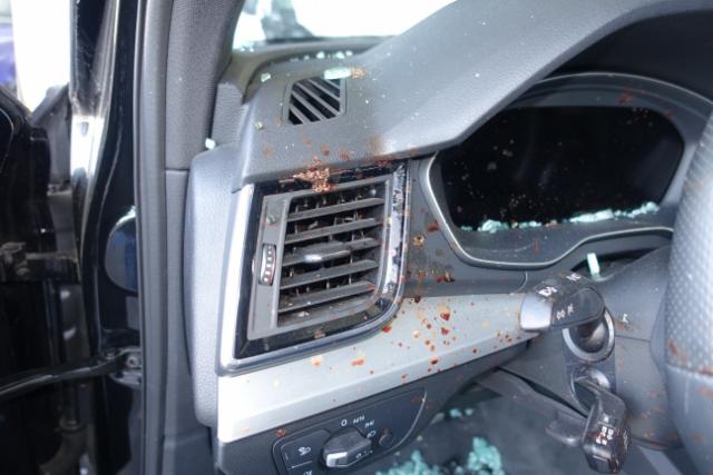 Motor läuft nicht an, Batterie entladen,Fahrzeug ist ringsum stark beschädigt. Blutspritzer im Fahrzeuginnenraum.