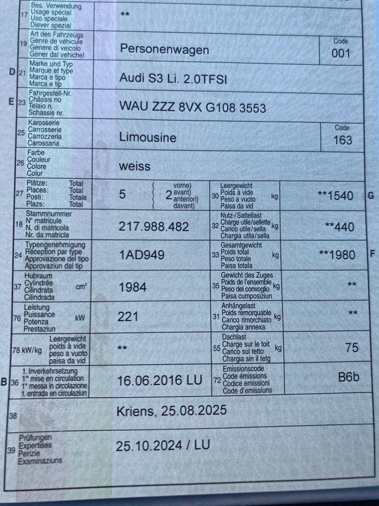 Toller AUDI S3 2.0TFSI Sedan - HANDSCHALTER!! Service 11.2025!! Kupplung kompl. erneuert 9.2024 vor ca. 10'000 km; Bremsen erneuert vor ca. 10'000 km; Hinterachs-Differential wurde fachmännisch revidiert im Aug. 2025!! Radlager hinten wurden ebenfalls im Aug. 2025 erneuert! Sommer u. Winterreifen auf Originalfelgen i.O.! Felgen teilweise etwas angefahren gem. Fotos! Zustand Carrosserie gem. Fotos gut-sehr gut! Leichte Lack-Abplatzer Stossstange hinten. Fahrzeug kann ohne weiteren Aufwand neu vorgeführt werden! Ersatz 2. Schlüssel kann evtl. über Versicherung abgewickelt werden. Fahrzeug ist service-gepflegt und in einem guten bis sehr guten Gesamtzustand! Innenraum in sehr gutem Zustand! VERKAUF IM KUNDENAUFTRAG! NUR SERIÖSE ANGEBOTE!! BARZAHLUNG bei Abholung! BESICHTIGUNG via 079 209 18 81 möglich!! Verkauf ab Platz ohne Garantie und Nachwährschaft, sowie Wandelung und Minderung ausgeschlossen. Fahrzeug wurde nicht von uns mechanisch geprüft, aber immer gut unterhalten und alles gemacht! Schäden und Zustand gem. Fotos und Informationen. Es werden keine Nachverhandlungen geführt, auch für Schäden die nicht sichtbar sind oder nicht deklariert wurden. Fahrzeug kann besichtigt werden, somit liegt das Risiko vollumfänglich beim Käufer. Fahrzeugabholung innerhalb von drei Arbeitstagen nach Erhalt des Zuschlages!