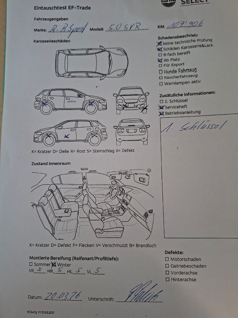 Keine technische Prüfung (Werkstatttest) vorgenommenDiverse Schäden an Karosserie/Lack.Fahrzeug ab Platz, ohne Garantie und Aufbereitung.DPF/FAP Filter nicht kontrolliert1 Schlüssel vorhandenBeule Türe vorne rechts