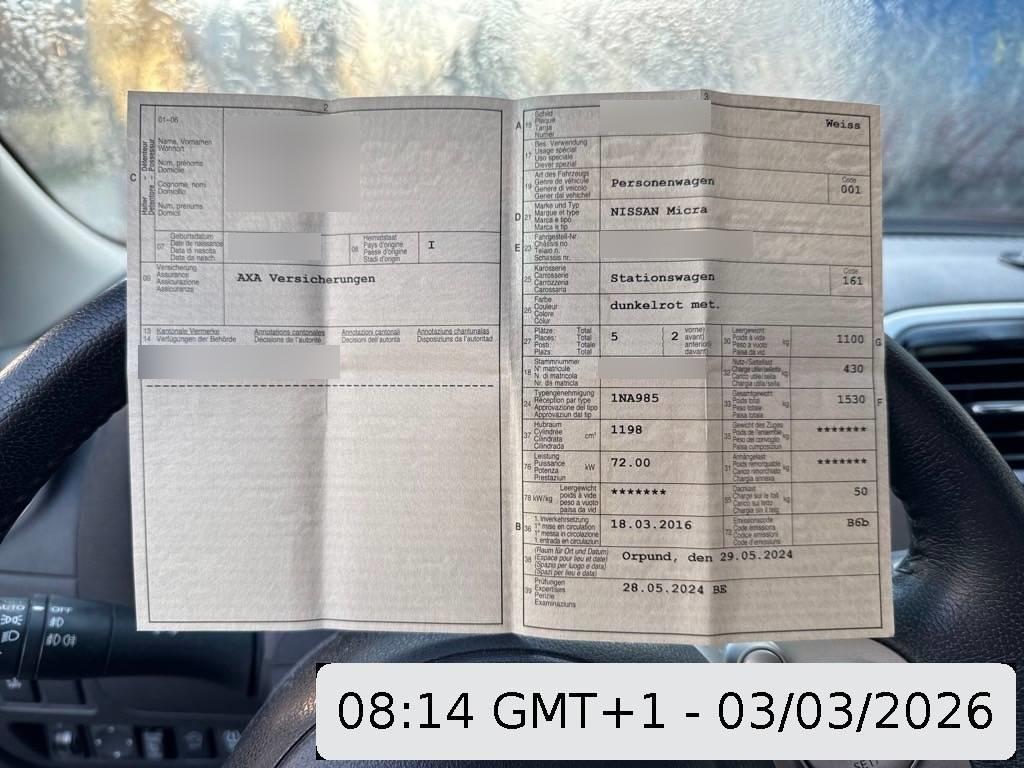 Lackierung: Uni-Lackierung, Elektrische Fensterheber vorne, Elektronisches Stabilitäts-Programm (ESP), Drehzahlmesser, Reifendruckkontrollsystem, Kopfstützen vorne höhenverstellbar, Armlehnen an den Türen, Leseleuchten vorne, Gangempfehlung, Sitze: ISOFIX-Befestigungspunkte für Kindersitz an den äusseren Rücksitzen, Wegfahrsperre elektronisch, Polster: Sitzbezüge Stoff, Dachspoiler, Seitenairbags vorne und Kopfairbags vorne und hinten, NissanConnect Services - In-Car Internet, - Basis Services NissanConnect App (kostenfrei), - Premium Services NissanConnect App (in den ersten drei Jahren kostenfrei)., Kopfstützen hinten höhenverstellbar, Smartphone Integration, Klimatisierungsautomatik, Heckscheibenheizung, Halogenscheinwerfer, Assist: Regensensor für Scheibenwischer vorne, Bluetooth-Schnittstelle mit Freisprecheinrichtung, Zentralverriegelung mit Fernbedienung, Aux-In Anschluss, 3-Punkt-Sicherheitsgurte auf allen Plätzen, Lenkrad: Lenkradfernbedienung, Handschuhfach verschliessbar, Geschwindigkeitsregler und -begrenzer, Scheiben Wärme und UV-absorbierend, Make up-Spiegel rechts, Bordcomputer, Anzeige von: Aussentemperatur, Verbrauch, Uhrzeit, Kraftstoffreserve, Geschwindigkeit, Wartungseinstellungen, Cupholder vorne und hinten, Drittes Bremslicht, Tageskilometerzähler, Make up-Spiegel links, Rücksitze geteilt abklappbar, Servolenkung geschwindigkeitsabhängig, Laderaumabdeckung, ABS, EBD elektronische Bremskraftverteilung, Gurtkontrolle, Steckdose 12V, Stossstangen in Wagenfarbe, Bremsassistent (BAS), Multifunktionslenkrad in Leder, Panorama-Glasdach, Tankdeckel-Entriegelung von innen, Stopp-/Start-System, Lenkrad höhenverstellbar, INTELLIGENT KEY, Kofferraumbeleuchtung, Aussenspiegel in Wagenfarbe, Frontscheibe Verbundglas, Defrosterdüsen für Front- und Seitenscheiben, 5-Gang-Getriebe, Kartentasche an der Rückenlehne, Licht: Fahrlichtautomatik, Airbag: Airbag Fahrer und Beifahrer, Automatische Türverriegelung geschwindigkeitsabhängig, Parkguide mit Parksensoren hinten Parklückenmessung, Mittelkonsole in Klavierlack-Finish, Kindersicherung an den hinteren Türen, 4 Leichtmetallfelgen 15J mit Pneu, Digitales Display, Nebelscheinwerfer, Nebelschlussleuchte, Türgriffe innen verchromt, Scheibenwischer vorne mit Intervall, Innenspiegel abblendbar, Aussenspiegel rechts und links beheizt, elektrisch verstell- / und einklappbar, Katalysator geregelt, Sitze: Vordersitze heizbar, Gurtstraffer vorne, Friendly Lighting, Türgriffe aussen in Wagenfarbe, Notrad, Airbag: Airbag Beifahrer deaktivierbar, Fahrersitz höhenverstellbar mit Armlehne, Pollenfilter (Staubfilter), Heckscheibenwischer, zweistufig