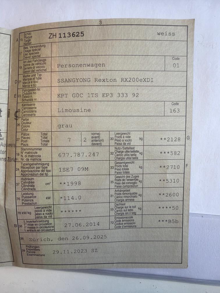 3. Sitzreihe fehlt Am Fahrzeug wurde kein Werkstatttest gemacht (Für sichtbare oder nicht sichtbare Mängel wird nicht gehaftet). Wir testen & kontrollieren nicht alle Funktionen des Fahrzeugs. Das Risiko liegt somit vollumfänglich beim Käufer. Ab Platz ohne Garantie, Wandelung und Minderung werden wegbedungen. Nach erteilte Zuschlag muss Fahrzeug innerhalb 4 Arbeitstage abgeholt und Bar bezahlt werden. Sonst wird Parkplatz CHF 30.- / Tag verrechnet Ab Service 15.03.2026