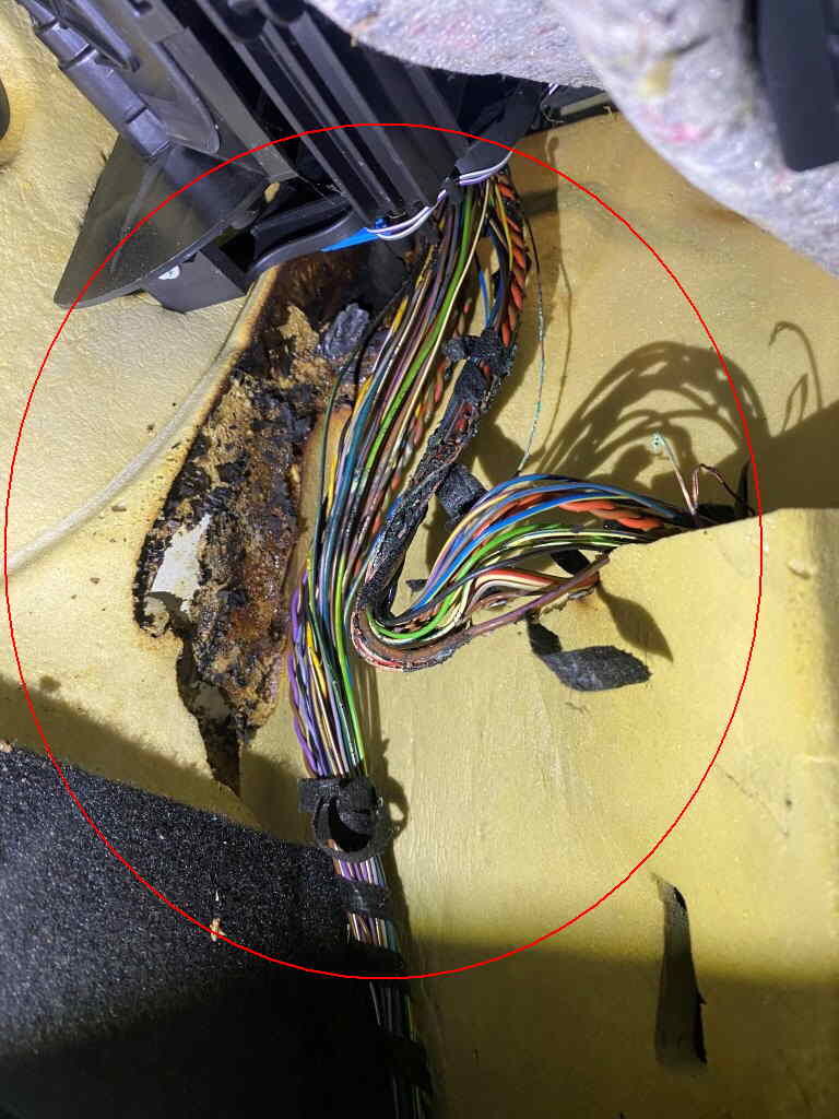 Kabelbrand am Türkabelstrang rechts und als Folgeschaden wurde der Hauptkabelstrang und diverse Dämmatten beschädigt. Diversers Fehler auf der Fahrzeugelektronik Motor Getriebe Vorderachse Hinterachse Airbags ausgelöst: 0 unbekannt ( Abfallcode 16.01.04ak )